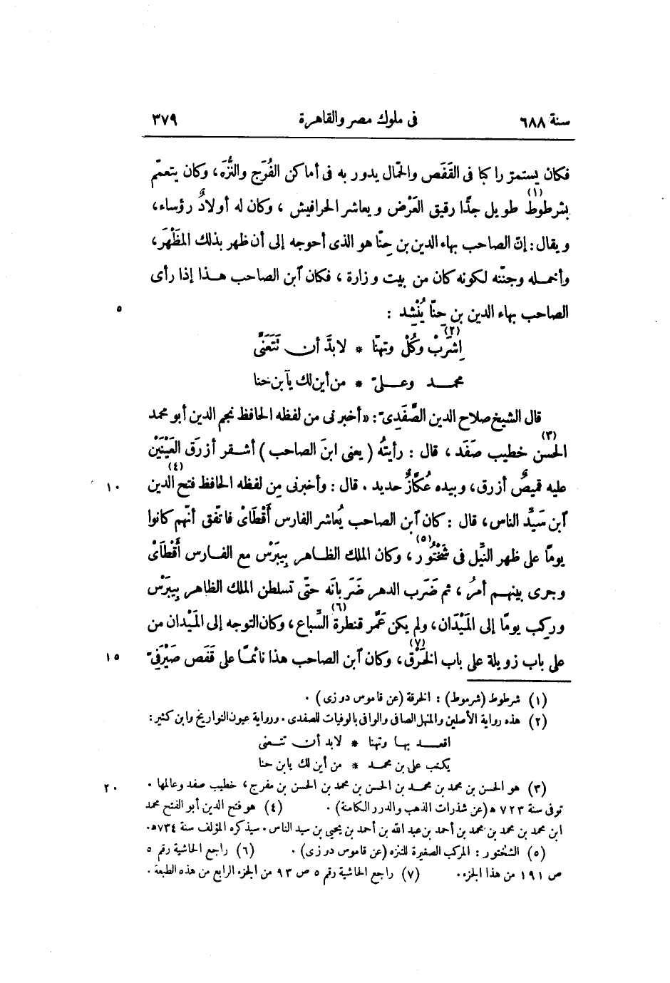 فكان يستمرّ راكبا فى القفص والحمّال يدور به فى أماكن الفرج والنّزه، وكان يتعمّم بشرطوط «1» طويل جدّا رقيق العرض ويعاشر الحرافيش، وكان له أولاد رؤساء، ويقال: إنّ الصاحب بهاء الدين بن حنّا هو الذي أحوجه إلى أن ظهر بذلك المظهر، وأخمله وجنّنه لكونه كان من بيت وزارة، فكان ابن الصاحب هذا إذا رأى الصاحب بهاء الدين بن حنّا ينشد: