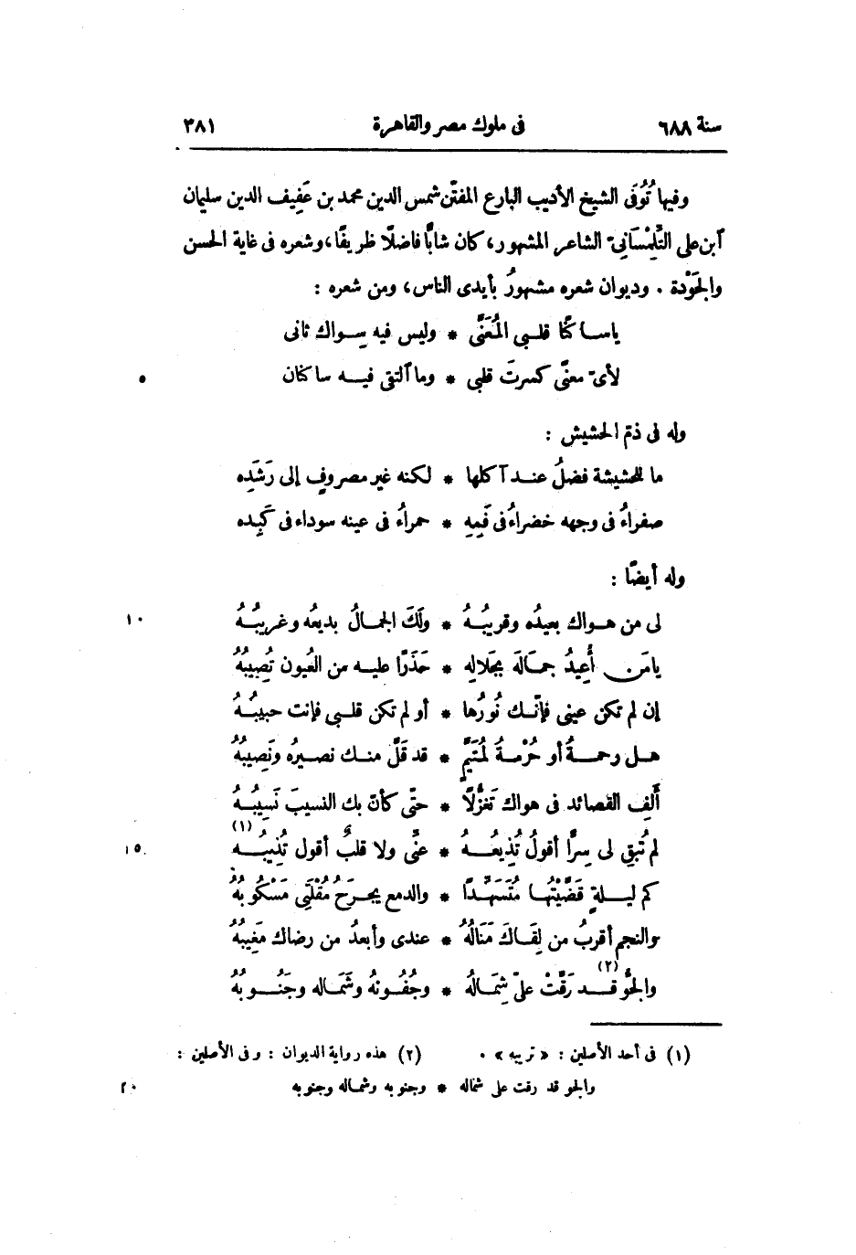 وفيها توفّى الشيخ الأديب البارع المفتّن شمس الدين محمد بن عفيف الدين سليمان ابن على التّلمسانىّ الشاعر المشهور، كان شابّا فاضلا ظريفا، وشعره فى غاية الحسن والجودة. وديوان شعره مشهور بأيدى الناس، ومن شعره: