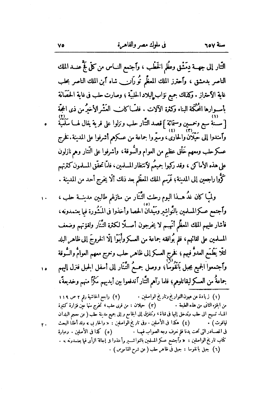 التّتار إلى جهة دمشق وعظم الخطب، واجتمع الناس من كلّ فجّ عند الملك الناصر بدمشق، واحترز الملك المعظّم توران شاه ابن الملك الناصر بحلب غاية الاحتراز. وكذلك جميع نوّاب البلاد الحلبيّة؛ وصارت حلب فى غاية الحصانة بأسوارها المحكمة البناء وكثرة الآلات. فلمّا كان العشر الأخير من ذى الحجّة [سنة «1» سبع وخمسين وستمائة] قصد التّتار حلب ونزلوا على قرية يقال لها سلمية «2» وامتدوا إلى حيلان «3» والحارى «4» ، وسيّروا جماعة من عسكرهم أشرفوا على المدينة. فخرج عسكر حلب ومعهم خلق عظيم من العوام والسّوقة، وأشرفوا على التّتار وهم نازلون على هذه الأماكن، وقد ركبوا جميعهم لانتظار المسلمين، فلمّا تحقّق المسلمون كثرتهم كرّوا راجعين إلى المدينة؛ فرسم الملك المعظّم بعد ذلك ألّا يخرج أحد من المدينة.