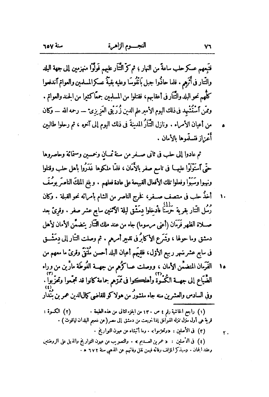 ثم عادوا إلى حلب فى ثانى صفر من سنة ثمان وخمسين وستمائة وحاصروها حتّى استولوا عليها فى تاسع صفر بالأمان، فلمّا ملكوها غدروا بأهل حلب وقتلوا ونهبوا وسبوا وفعلوا تلك الأفعال القبيحة على عادة فعلهم. وبلغ الملك الناصر يوسف أخذ حلب فى منتصف صفر، فخرج الناصر من الشام بأمرائه نحو القبلة. وكان رسل التّتار بقرية حرستا «1» فأدخلوا دمشق ليلة الاثنين سابع عشر صفر. وقرئ بعد صلاة الظهر فرمان (أعنى مرسوما) جاء من عند ملك التّتار يتضمّن الأمان لأهل دمشق وما حولها، وشرع الأكابر فى تدبير أمرهم. ثم وصلت التّتار إلى دمشق فى سابع عشر شهر ربيع الأوّل، فلقيهم أعيان البلد أحسن ملتقى وقرئ ما معهم من الفرمان المتضمّن الأمان، ووصلت عساكرهم من جهة الغوطة مارّين من وراء الضّياع إلى جهة الكسوة «2» وأهلكوا فى ممرّهم جماعة كانوا قد تجمّعوا وتحزّبوا «3» .