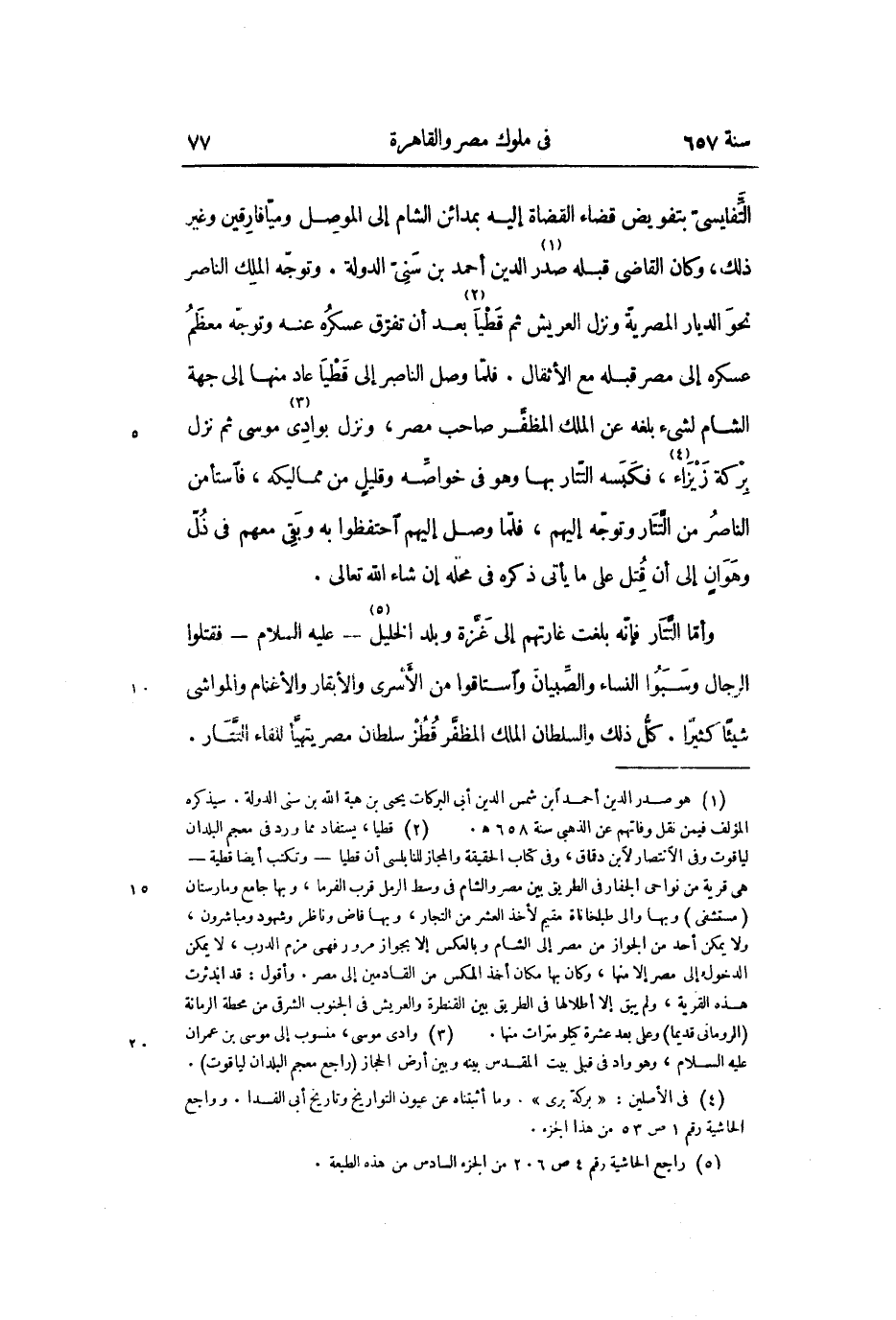 التّفايسىّ بتفويض قضاء القضاة إليه بمدائن الشام إلى الموصل وميّافارقين وغير ذلك، وكان القاضى قبله صدر «1» الدين أحمد بن سنىّ الدولة. وتوجّه الملك الناصر نحو الديار المصريّة ونزل العريش ثم قطيا «2» بعد أن تفرّق عسكره عنه وتوجّه معظم عسكره إلى مصر قبله مع الأثقال. فلمّا وصل الناصر إلى قطيا عاد منها إلى جهة الشام لشىء بلغه عن الملك المظفّر صاحب مصر، ونزل بوادى «3» موسى ثم نزل بركة زيزاء «4» ، فكبسه التّتار بها وهو فى خواصّه وقليل من مماليكه، فاستأمن الناصر من التّتار وتوجّه إليهم، فلمّا وصل إليهم احتفظوا به وبقى معهم فى ذلّ وهوان إلى أن قتل على ما يأتى ذكره فى محله إن شاء الله تعالى.
