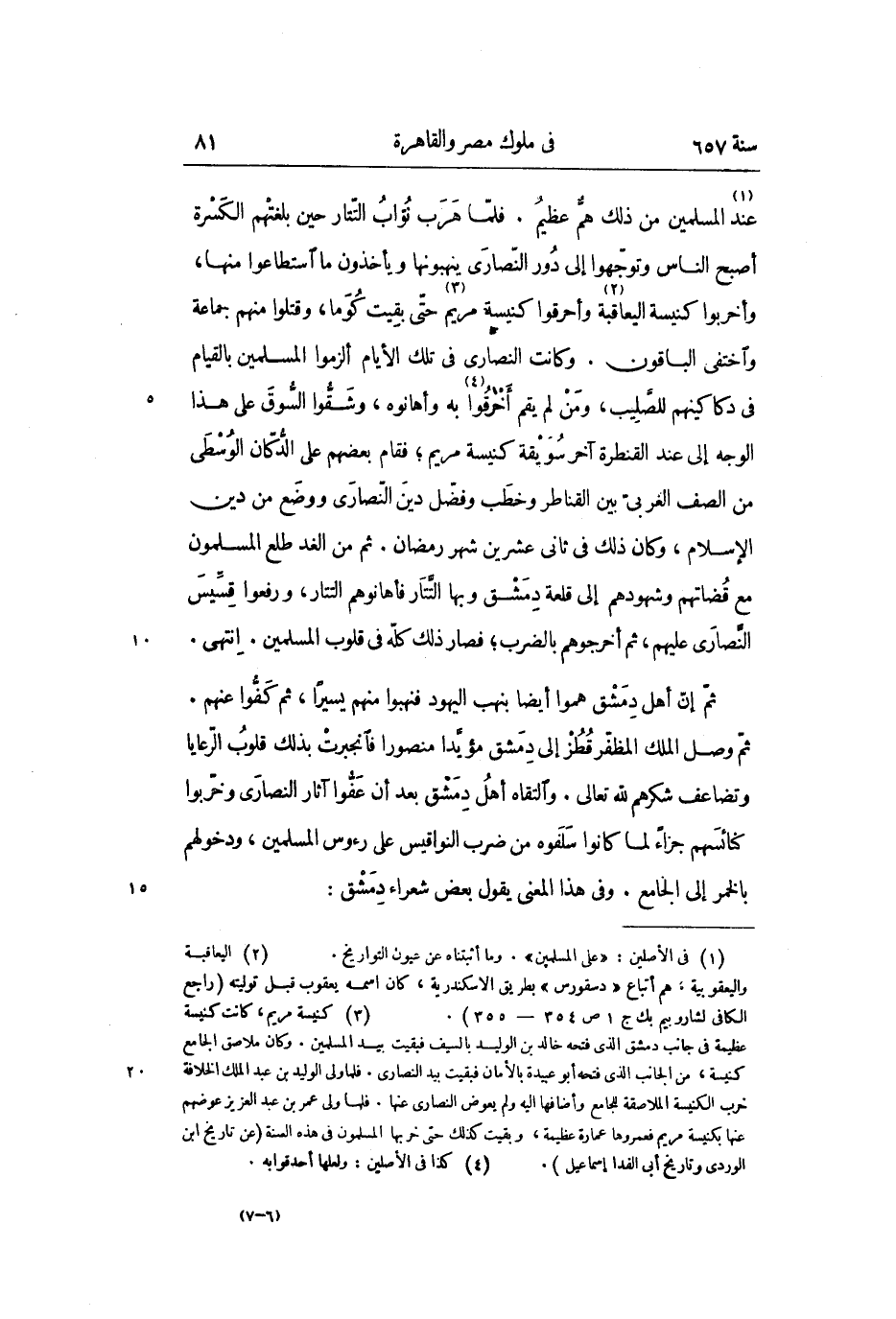 ثمّ وصل الملك المظفّر قطز إلى دمشق مؤيّدا منصورا فانجبرت بذلك قلوب الرّعايا وتضاعف شكرهم لله تعالى. والتقاه أهل دمشق بعد أن عفّوا آثار النصارى وخرّبوا كنائسهم جزاء لما كانوا سلفوه من ضرب النواقيس على رءوس المسلمين، ودخولهم بالخمر إلى الجامع. وفى هذا المعنى يقول بعض شعراء دمشق: