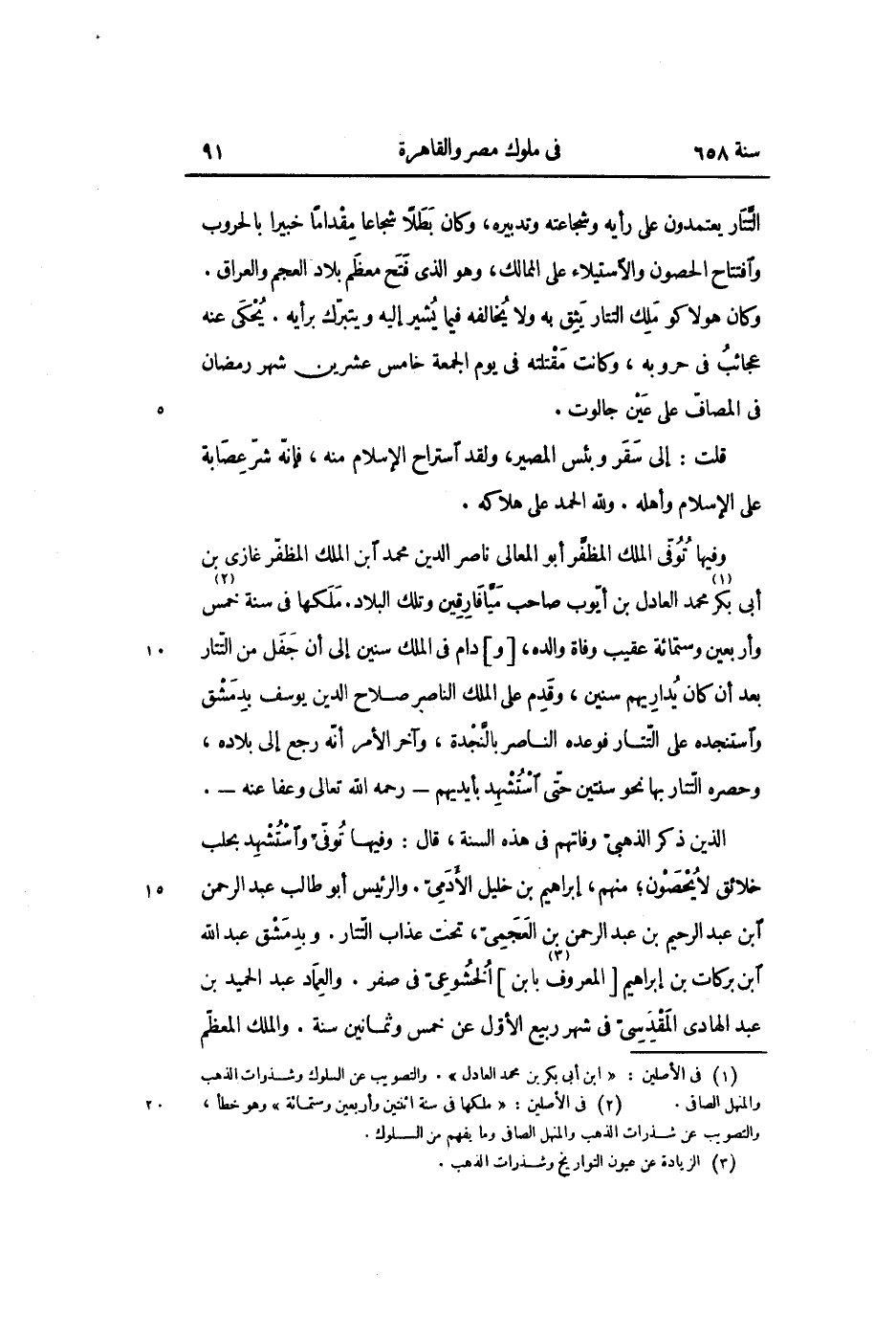 وفيها توفّى الملك المظفّر أبو المعالى ناصر الدين محمد ابن الملك المظفّر غازى بن أبى بكر «1» محمد العادل بن أيّوب صاحب ميّافارقين وتلك البلاد. ملكها فى سنة «2» خمس وأربعين وستمائة عقيب وفاة والده، [و] دام فى الملك سنين إلى أن جفل من التّتار بعد أن كان يداريهم سنين، وقدم على الملك الناصر صلاح الدين يوسف بدمشق واستنجده على التّتار فوعده الناصر بالنّجدة، وآخر الأمر أنّه رجع إلى بلاده، وحصره التّتار بها نحو سنتين حتّى استشهد بأيديهم- رحمه الله تعالى وعفا عنه-.
