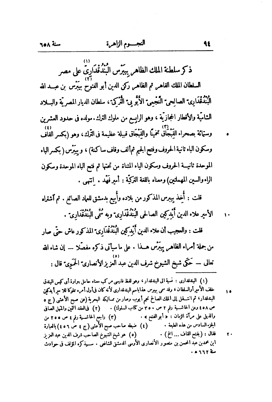 السلطان الملك القاهر ثم الظاهر ركن الدين أبو الفتوح «2» بيبرس بن عبد الله البندقدارىّ الصالحىّ النّجمىّ الأيّوبىّ التّركىّ، سلطان الديار المصريّة والبلاد الشاميّة والأقطار الحجازيّة، وهو الرابع من ملوك الترك. مولده فى حدود العشرين وستمائة بصحراء القبجاق «3» تخمينا والقبجاق قبيلة عظيمة فى التّرك، وهو (بكسر القاف «4» وسكون الباء ثانية الحروف وفتح الجيم ثم ألف وقاف ساكنة) ، وبيبرس (بكسر الباء الموحدة ثانية الحروف وسكون الياء المثناة من تحتها ثم فتح الباء الموحدة وسكون الراء والسين المهملتين) ومعناه باللغة التركيّة: أمير فهد. انتهى.