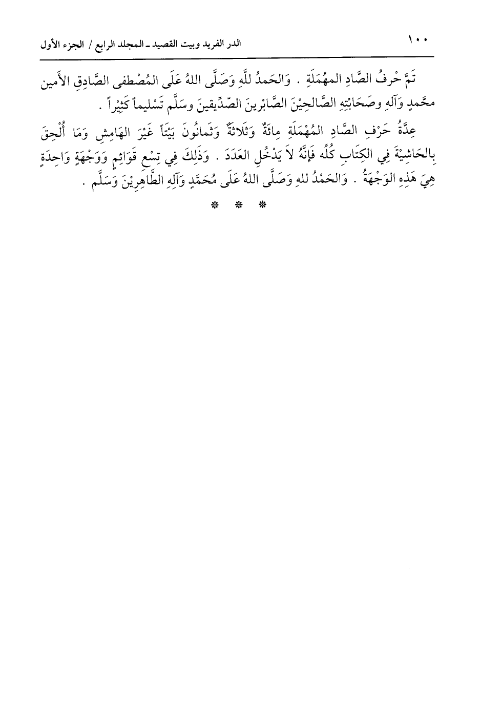 عِدَّةُ حَرْفِ الصادِ المُهْمَلَةِ مِائَةٌ وَثَلاثَةٌ وَثَمانُونَ بَيْتًا غَيْرَ الهَامِشِ وَمَا أُلْحِقَ بِالحَاشِيْةَ فِي الكِتَابِ كُلِّه فَإِنَّهُ لَا يَدْخُلِ العَدَدَ. وَذَلِكَ فِي تِسْعِ قَوَائِمٍ وَوَجْهَةٍ وَاحِدَةٍ هِيَ هَذِهِ الوَجْهَةُ. وَالحَمْدُ للَّهِ وَصلَّى اللَّهُ عَلَى مُحَمَّدٍ وَآلِهِ الطَّاهِرِيْنَ وَسَلَّم.
