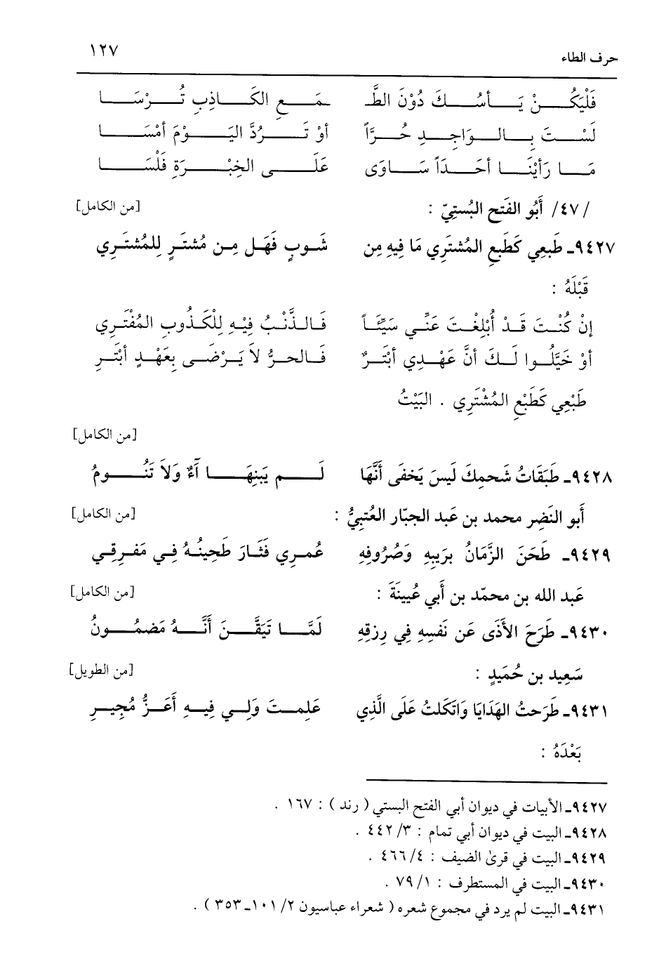 9431 - البيت لم يرد في مجموع شعره (شعراء عباسيون 2/ 101 - 353).