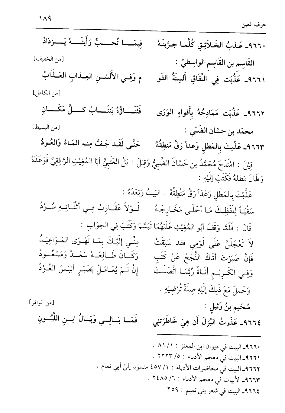9663 - عَذُبتَ بِالمَطلِ وَعدًا رَقَّ مَنطِقُهُ ... حَتَّى لَقَد جَفَّ مِنه المَاءُ وَالعُودُ
