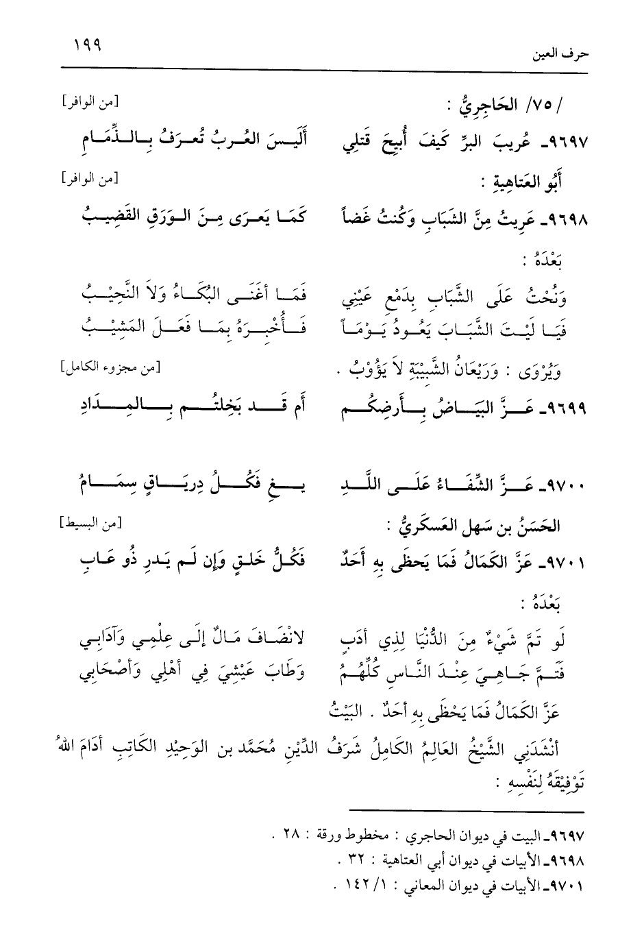 أنْشَدَنِي الشَّيْخُ العَالِمُ الكَامِلُ شَرَفُ الدِّيْنِ مُحَمَّد بن الوَحِيْدِ الكَاتِبِ أدَامَ اللَّهُ تَوْفِيْقَهُ لِنَفْسِهِ: