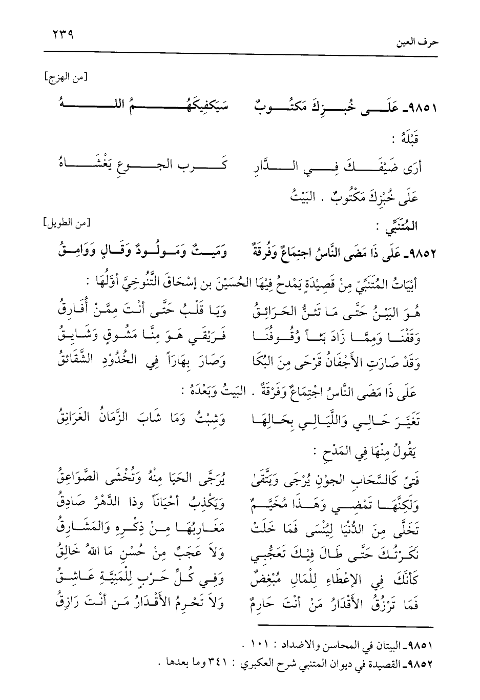 أبْيَاتُ المُتَنَبِّيّ مِنْ قَصِيْدَةٍ يَمْدحُ فِيْهَا الحُسَيْنَ بن إسْحَاقَ التَّنُوخِيَّ أوَّلُهَا: