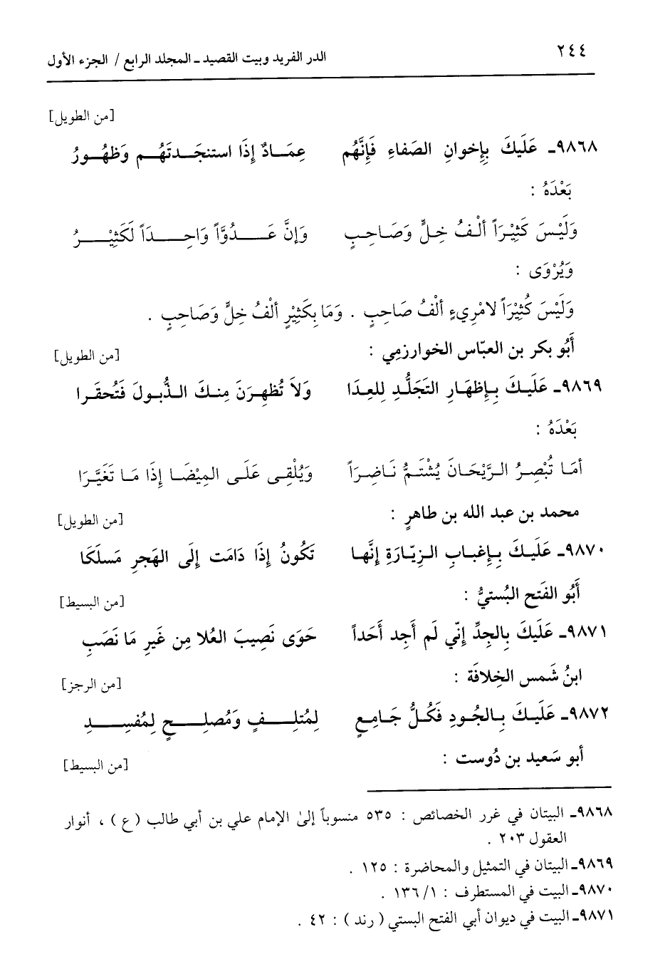 9868 - عَلَيكَ بِإِخوانِ الصَفاءِ فَإِنَّهُم ... عِمَادٌ إِذَا استنجَدتَهُم وَظهُورُ
