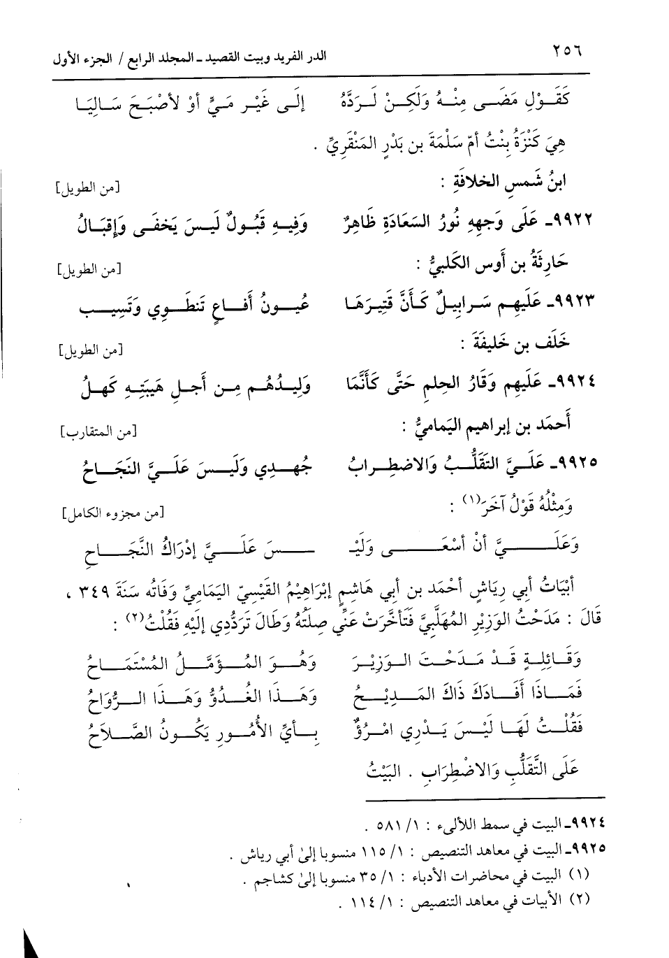 أبْيَاتُ أَبِي رِيَاشٍ أحْمَد بن أَبِي هَاشِمٍ إبْرَاهِيْمُ القَيْسِيّ اليَمَامِيِّ وَفَاتُه سَنَةَ 349، قَالَ: مَدَحْتُ الوَزِيْرِ المُهَلَّبِيَّ فَتَأخَّرَتْ عَنِّي صِلَتُهُ وَطَالَ تَرَدُّدِي إلَيْهِ فَقُلْتُ (¬2):