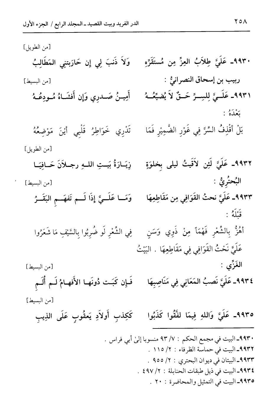 9930 - البيت في مجمع الحكم: 7/ 93 منسوبا إلى أبي فراس.