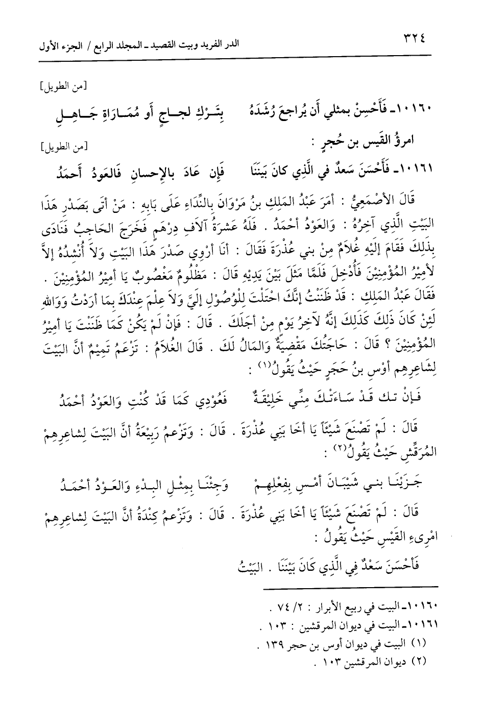 قَالَ الأصْمَعِيُّ: أمَرَ عَبْدُ المَلِكِ بنُ مَرْوَانَ بِالنِّدَاءِ عَلَى بَابِهِ: مَنْ أَتَى بَصَدْرِ هَذَا البَيْتِ الَّذِي آخِرُهُ: وَالعَوْدُ أحْمَدُ. فَلَهُ عَشرَةُ آلَافِ دِرْهَمٍ فَخَرَجَ الحَاجِبُ فَنَادَى بِذَلِكَ فَقَامَ إلَيْهِ غُلَامٌ مِن بني عُذْرَةَ فَقَالَ: أَنَا أرْوِي صدْرَ هَذَا البَيْتِ وَلَا أُنْشِدُهُ إِلَّا لأمِيْرُ المُؤْمِنِيْنَ فَأُدْخِلَ فَلَمَّا مَثَلَ بَيْنَ يَدِيْهِ قَالَ: مَظْلُومٌ مَغْصُوبٌ يَا أمِيْرُ المُؤْمِنِيْنَ. فَقَالَ عَبْدُ المَلِكِ: قَدْ ظَنَنْتُ إنَّكَ احْتَلْتَ لِلْوُصُوْلِ إلَيَّ وَلَا عِلْمَ عِنْدَكَ بِمَا أرَدْتُ وَوَاللَّهِ لَئِنْ كَانَ ذَلِكَ كَذَلِكَ إنَّهُ لآخِرُ يَوْمٍ مِنْ أجَلَكَ. قَالَ: فَإنْ لَمْ يَكُنْ كَمَا ظَنَنْتَ يَا أمِيْرُ المُؤْمِنِيْنَ؟ قَالَ: حَاجَتُكَ مَقْضِيَةٌ وَالمَالُ لَكَ. قَالَ الغُلَامُ: تَزْعَمُ تَمِيْمٌ أَنَّ البَيْتَ لِشَاعِرِهِم أوْسِ بنُ حَجَرٍ حَيْثُ يَقُولُ (¬1):