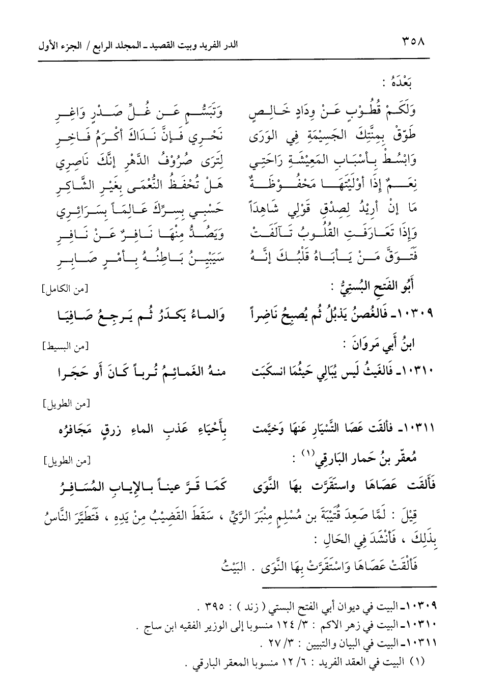 (¬1) البيت في العمد الفريد: 6/ 12 منسوبا المعقر البارقي.