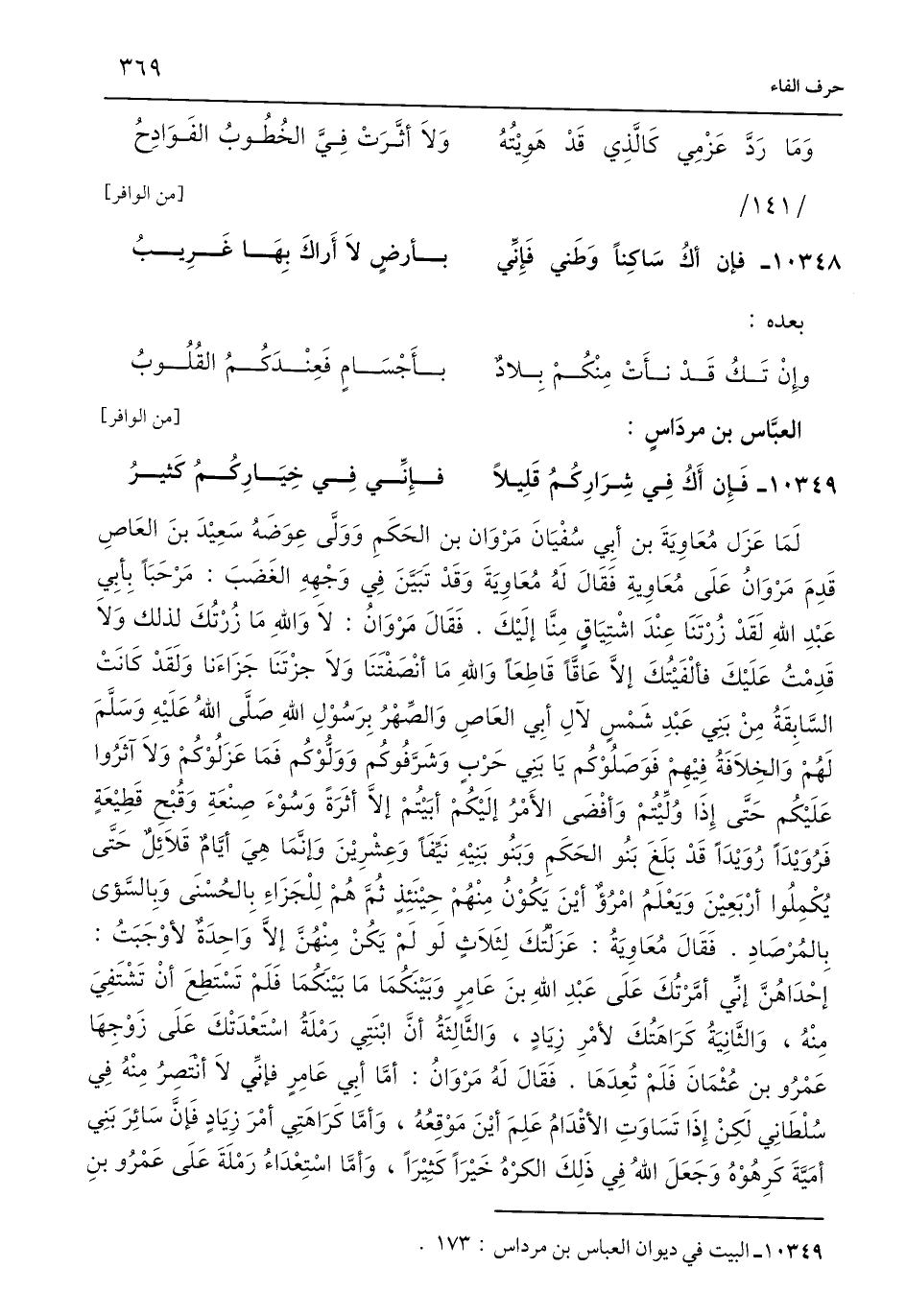 لَمَا عَزَل مُعَاوِيَةَ بن أَبِي سُفْيَانَ مَرْوَان بن الحَكَمِ وَوَلَّى عِوَضَهُ سَعِيْدَ بنَ العَاصِ قَدِمَ مَرْوَانُ عَلَى مُعَاوِيةِ فَقَالَ لَهُ مُعَاوِيَةَ وَقَدْ تَبَيَّنَ فِي وَجْهِهِ الغَضَبَ: مَرْحَبًا بِأبِي عَبْدِ اللَّهِ لَقَدْ زُرْتَنَا عِنْدَ اشْتِيَاقٍ مِنَّا إلَيْكَ. فَقَالَ مَرْوَانُ: لَا وَاللَّهِ مَا زُرْتُكَ لذلك وَلَا قَدِمْتُ عَلَيْكَ فألْفَيْتُكَ إِلَّا عَاقًّا قَاطِعًا وَاللَّهِ مَا أنْصَفْتَنَا وَلَا جزْتَنَا جَزَاءَنا وَلَقَدْ كَانَتْ السَّابِقَةُ مِنْ بَنِي عَبْدِ شَمْسٍ لآلِ أَبِي العَاصِ وَالصهْرُ بِرَسُوْلِ اللَّهِ صَلَّى اللَّهُ عَلَيْهِ وَسَلَّمَ لَهُمْ وَالخِلَافَةُ فِيْهِمْ فَوَصَلُوْكُم يَا بَنِي حَرْبٍ وَشَرَّفُوكُم وَوَلُّوْكُم فَمَا عَزَلُوْكُمْ وَلَا آثَرُوا عَلَيْكُم حَتَّى إِذَا وُلِّيْتُمْ وَأفْضَى الأَمْرُ إلَيْكُمْ أبَيْتُمْ إِلَّا أثَرَةً وَسُوْءَ صِنْعَةِ وَقُبْحِ قَطِيْعَةٍ فَرُوَيْدًا رُوَيْدًا قَدْ بَلَغَ بَنُو الحَكَمِ وَبَنُو بَنِيْهِ نَيِّفًا وَعِشْرِيْنَ وَإِنَّمَا هِيَ أيَّامٌ قَلَائِلٌ حَتَّى يُكْمِلُوا أرْبَعِيْنَ وَيَعْلَمُ امْرُؤٌ أيْنَ يَكُوْنُ مِنْهُمْ حِيْنَئِذٍ ثُمَّ هُمْ لِلْجَزَاءِ بِالحُسْنَى وَبِالسَّؤى بِالمُرْصادِ. فَقَالَ مُعَاوِيَةُ: عَزَلْتُكَ لِثَلَاثٍ لَو لَمْ يَكُنْ مِنْهُنَّ إِلَّا وَاحِدَةٌ لأوْجَبَتُ: إحْدَاهُنَّ إنِّي أمَّرْتُكَ عَلَى عَبْدِ اللَّهِ بنَ عَامِرٍ وَبَيْنَكُمَا مَا بَيْنَكُمَا فَلَمْ تَسْتَطِعَ أنْ تَشْتَفِيَ مِنْهُ، وَالثَّانِيَةُ كَرَاهَتُكَ لأمْرِ زِيَادٍ، وَالثَّالِثَةُ أَنَّ ابْنَتِي رَمْلَةُ اسْتَعْدَتْكَ عَلَى زَوْجِهَا عَمْرُو بن عُثْمَانَ فَلَمْ تُعِدَهَا. فَقَالَ لَهُ مَرْوَانُ: أَمَّا أَبِي عَامِرٍ فإنِّي لَا أنتصِرُ مِنْهُ فِي سُلْطَانِي لَكِنْ إِذَا تَسَاوَتِ الأقْدَامُ عَلِمَ أيْنَ مَوْقِعُهُ، وَأَمَّا كَرَاهَتِي أمْرَ زِيَادٍ فَإنَّ سَائِرَ بَنِي أمَيَّةَ كَرِهُوْهُ وَجَعَلَ اللَّهُ فِي ذَلِكَ الكرْهُ خَيْرًا كَثيْرًا، وَأَمَّا اسْتِعْدَاءُ رَمْلَةَ عَلَى عَمْرُو بنِ