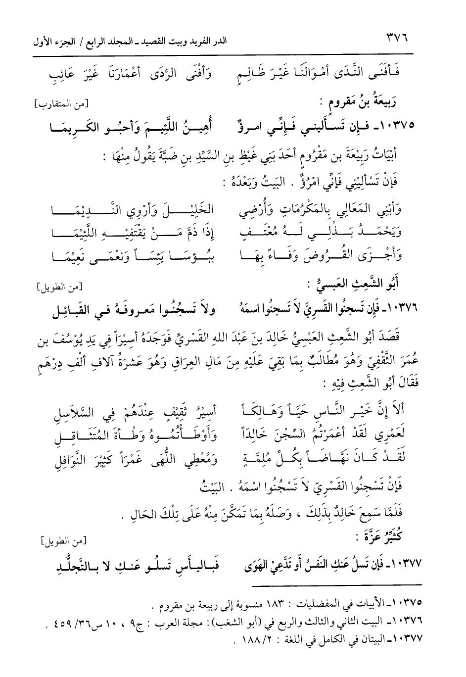 10375 - الأبيات في المفضليات: 183 منسوبة إلى ربيعة بن مقروم.