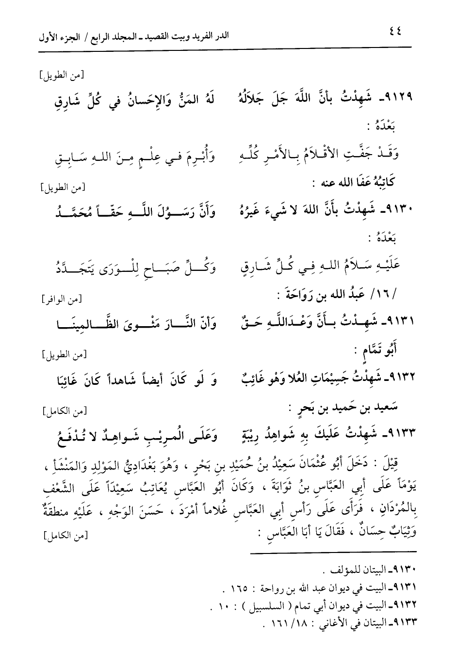 9129 - شَهِدْتُ بأنَّ اللَّهَ جَلَ جَلَالُهُ ... لَهُ المَنُّ وَالإِحَسانُ في كُلِّ شَارِقِ