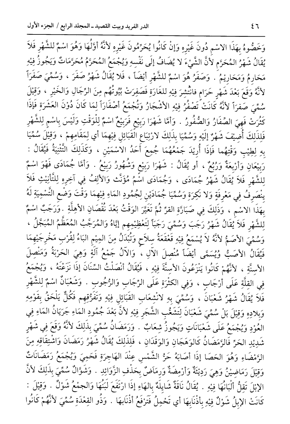 وَخَصُّوهُ بِهَذَا الاسْمِ دُونَ غَيْرِهِ وَإِنْ كَانُوا يُحَرِّمُونَ غَيْرِهِ لأَنَّهُ أوَّلُهَا وَهُوَ اسْمٌ للشَّهْرِ فَلَا يُقَالُ شَهْرُ المُحَرَّمِ لأنَّ الشَّيْءَ لا يُضَافُ إِلَى نَفْسِهِ وَيُجْمَعُ المُحَرَّمُ مُحَرَّمَاتٌ وَيَجُوزُ فِيْهِ مَحَارِمُ وَمَحَارِيْمُ. وَصَفَرُ هُوَ اسْمٌ للشَّهْرِ أَيْضًا، فَلا يُقَالُ شَهْرُ صَفَرَ، وَسُمِّيَ صَفَرًا لأَنَّهُ وَقَعَ بَعْدَهُ شَهْرٍ حَرَامٍ فانْتُشِرَ فِيْهِ للغَارَةِ فَصفِرَتْ بُيُوتُهُم مِنَ الرِّجَالِ وَالخَيْرِ، وَقِيْلَ سُمِّيَ صَفرًا لأَنَّهُ كَانَتْ تَصْفُرُ فِيْهِ الأشْجَارُ وَتُجْمِعُ أصْفَارًا لِمَا كَانَ دُوْنَ العَشَرَةِ فَإِذَا كَثُرَتْ فَهِيَ الصِّفَارُ وَالصُّفُورُ. وَأَمَّا شَهْرَا رَبِيع فرَبِيعٌ اسْمٌ لِلْوَقْتِ وَلَيْسَ بِاسْمٍ لِلشَّهْرِ فَلِذَلِكَ أُضِيْفَ شَهْرٌ إلَيْهِ وَسُمِّيَا بِذَلِكَ لارْتِبَاعِ القَبَائِلِ فِيْهِمَا أي لِمَقَامِهِمْ، وَقِيْلَ سُمِّيَا بِهِ لِطِيْبِ وَقْتِهُما فَإِذَا أُرِيْدَ جَمْعُهُمَا جُمِعَ أَحَدُ الاسْمَيْنِ، وَكَذَلِكَ التَّثْنِيَةُ فَيُقَالُ: رَبِيْعَانِ وَأرْبِعَةٌ وَرُبُعٌ، أو يُقَالُ: شَهْرَا رَبِيعٍ وَشُهُورُ رَبِيْعُ. وَأَمَّا جُمَادَى فَهْوَ اسْمٌ لِلشَّهْرِ فَلَا يُقَالُ شَهْرُ جُمَادَى، وَجُمَادَى اسْمُ مُؤَنَّث وَالألِفُ فِي آخِرِهِ لِلتَّأنِيْثِ فَلَا يِنْصَرِفُ فِي مَعْرِفَةٍ وَلَا نَكِرَةِ وَسُمِّيَا جُمَادَيْنِ لِجُمُودِ المَاءِ فِيْهِمَا وَقْتَ وَضْعِ التَّسْمِيَةِ لَهُ بِهَذَا الاسْمِ، وَذَلِكَ فِي صَبَارَّةِ القرِّ ثُمَّ تَغَيَّرَ الوَقْتُ بَعْدَهُ نُقْصَانِ الأهِلَّةِ. وَرَجَبٌ اسْمٌ لِلشَّهْرِ فَلَا يُقَالُ شَهْرُ رَجَبَ وَسُمِّيَ رَجَبًا لِتَعْظيْمِهِم إيَّاهُ وَالمُرَجَّبُ المُعَظَّمُ المُبَجَّلُ، وَسُمِّيَ الأصَمُّ لأَنَّهُ لَا يُسْمَعُ فِيْهِ قَعْقَعَةُ سِلَاحٍ وَتُبْدَلُ مِنَ المِيْمِ البَاءُ لِقُرْبِ مَخْرِجَيْهِمَا فَيُقَالُ الأصَبُّ وُيُسَمَّى أَيْضًا مُنْصِلَ الآلِ، وَالآلُ جَمْعُ آلَةٍ وَهِيَ الحَرْبَةُ وَمَنْصِلَ الأسِنَّةِ، لأنَّهُمْ كَانُوا يَنْزَعُونَ الأسِنَّةَ فِيْهِ، فَيُقَالُ أنْصَلْتُ السِّنَانَ إِذَا نَزَعْتَهُ، وَيُجْمَعُ فِي القِلَّةِ عَلَى أرْجَابٍ، وَفِي الكثْرَةِ عَلَى الرِّجَابِ وَالرُّجُوبِ. وَشَعْبَان اسْمٌ لِلشَّهْرِ فَلَا يُقَالُ شَهْرُ شَعْبَانَ، وَسُمِّيَ بِهِ لانْشِعَابِ القَبَائِلِ فِيْهِ وَتَفَرُّقِهِم فَكُلٌّ يَلْحَقُ بِقَوْمِهِ وَبِلادِهِ وَقِيْلَ بَلْ سُمِّيَ شَعْبَانَ لِتَشَعُّبِ الشَّجَرِ فِيْهِ لأنَّ بَعْدَ جُمُودِ المَاءِ جَرَيَانُ المَاءِ فِي العُوْدِ وَيُجْمَعُ عَلَى شَعْبَانَاتٍ وَيَجُوزُ شِعَابٌ. وَرَمَضَانُ سُمِّيَ بِذَلِكَ لأَنَّهُ وَقَعَ فِي شَهْرٍ شَدِيْدِ الحَرِّ فَالرَّمَضَانُ كَالوَهَجَانِ وَالوَقَدَانِ، فَلِذَلِكَ يُقَالُ شَهْرُ رَمَضَانَ وَاشْتِقَاقِهِ مِنَ الرَّمْضَاءِ وَهُوَ الحَصا إِذَا أصَابَهُ حَرُّ الشَّمْسِ عِنْدَ الهَاجِرَةِ فَحَمِيَ وَيُجْمَعُ رَمَضَانَاتٌ وَقِيْلَ رَمَاضِيْنُ وَهِيَ رَدِيْئَةٌ وَأرْمِضَةٌ وَرِمَاَضٌ بِحَذْفِ الزَّوَائِدِ. وَشَوَّالٌ سُمِّيَ بِذَلِكَ لأنَّ الإبْلَ تَقِلُّ ألْبَانُهَا فِيْهِ. يُقَالُ نَاقَةٌ شَايِلَهٌ بِالهَاءِ إِذَا ارْتَفَعَ لَبَنُهَا وَالجمْعُ شَوْلٌ. وَقِيْلَ: كَانَتْ الإبِلُ شَوْلٌ فِيْهِ بِأذْنَابِهَا أي تَحْمِلُ فَتَرْفَعُ أذْنَابهَا. وَذُو القِعْدَةِ سُمِّيَ لأنَّهُمْ كَانُوا