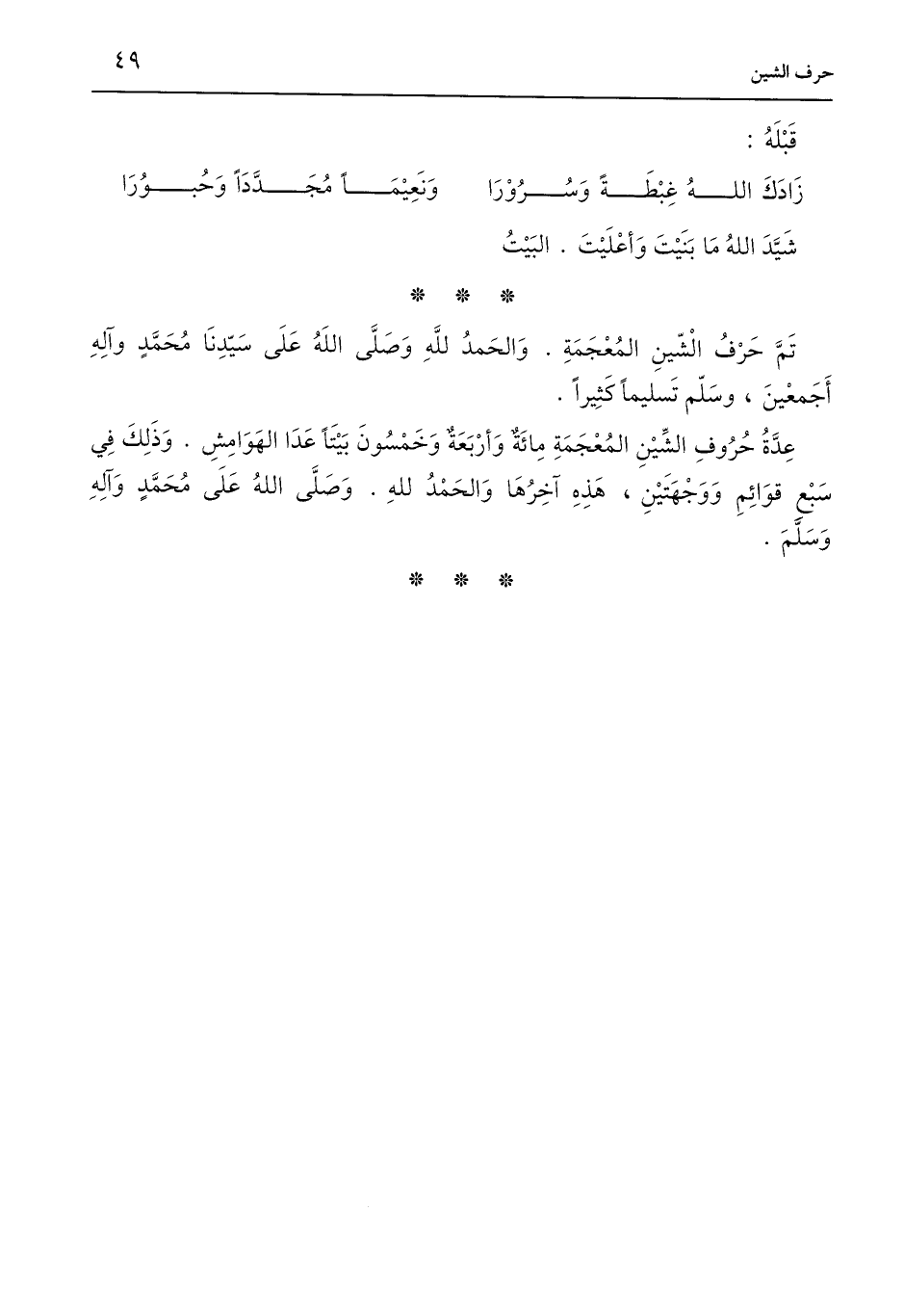 تَمَّ حَرْفُ الشِّيْنِ المُعْجَمَةِ. وَالحَمدُ للَّهِ وَصلَّى اللَهُ عَلَى سَيّدِنَا مُحَمَّدٍ وآلِهِ أَجَمعْينَ، وسَلّم تَسليمًا كَثِيرًا.