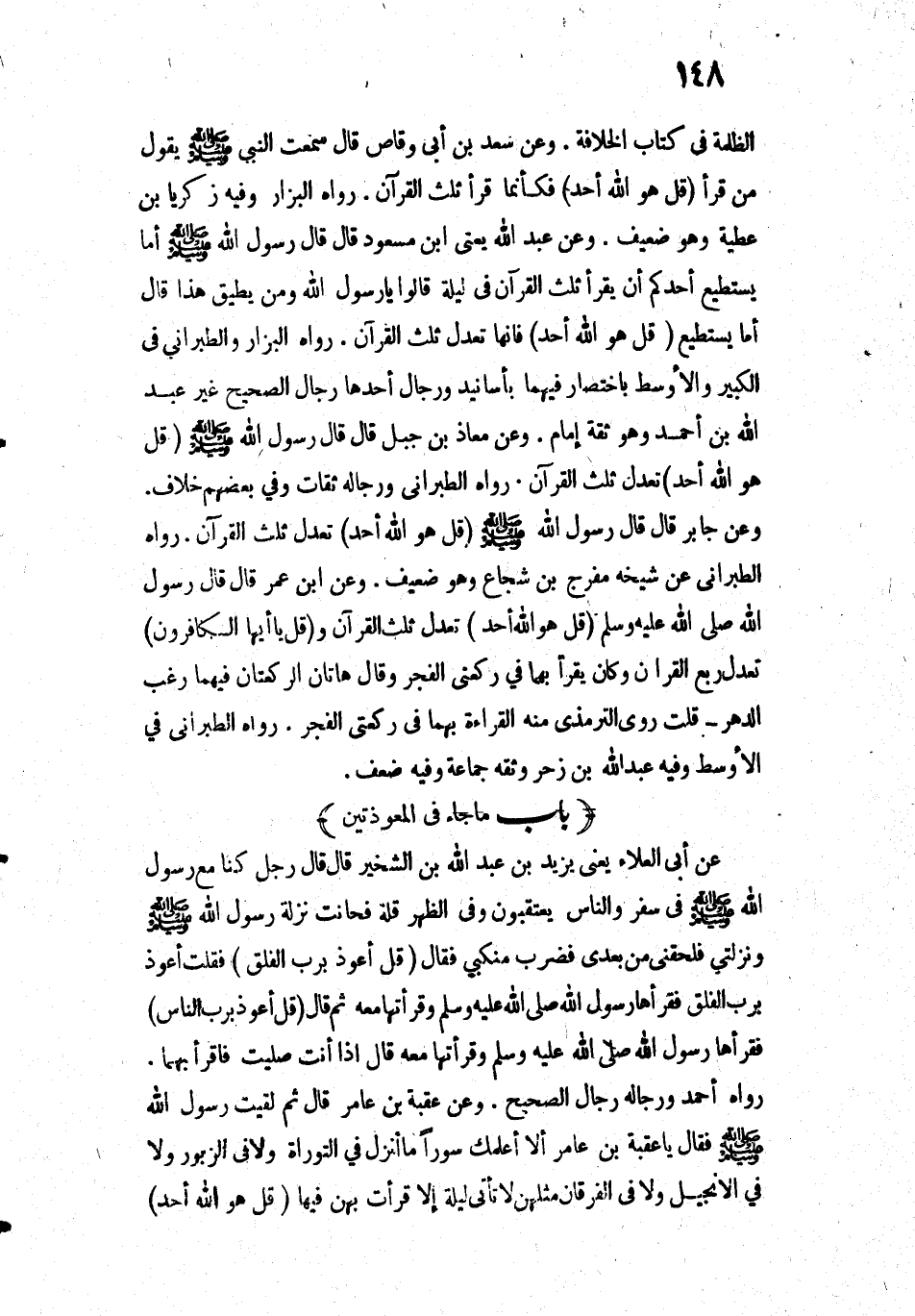 11554 - وَعَنْ جَابِرٍ قَالَ: قَالَ رَسُولُ اللَّهِ - صَلَّى اللَّهُ عَلَيْهِ وَسَلَّمَ -: «{قُلْ هُوَ اللَّهُ أَحَدٌ} [الإخلاص: 1] تَعْدِلُ ثُلُثَ الْقُرْآنِ».