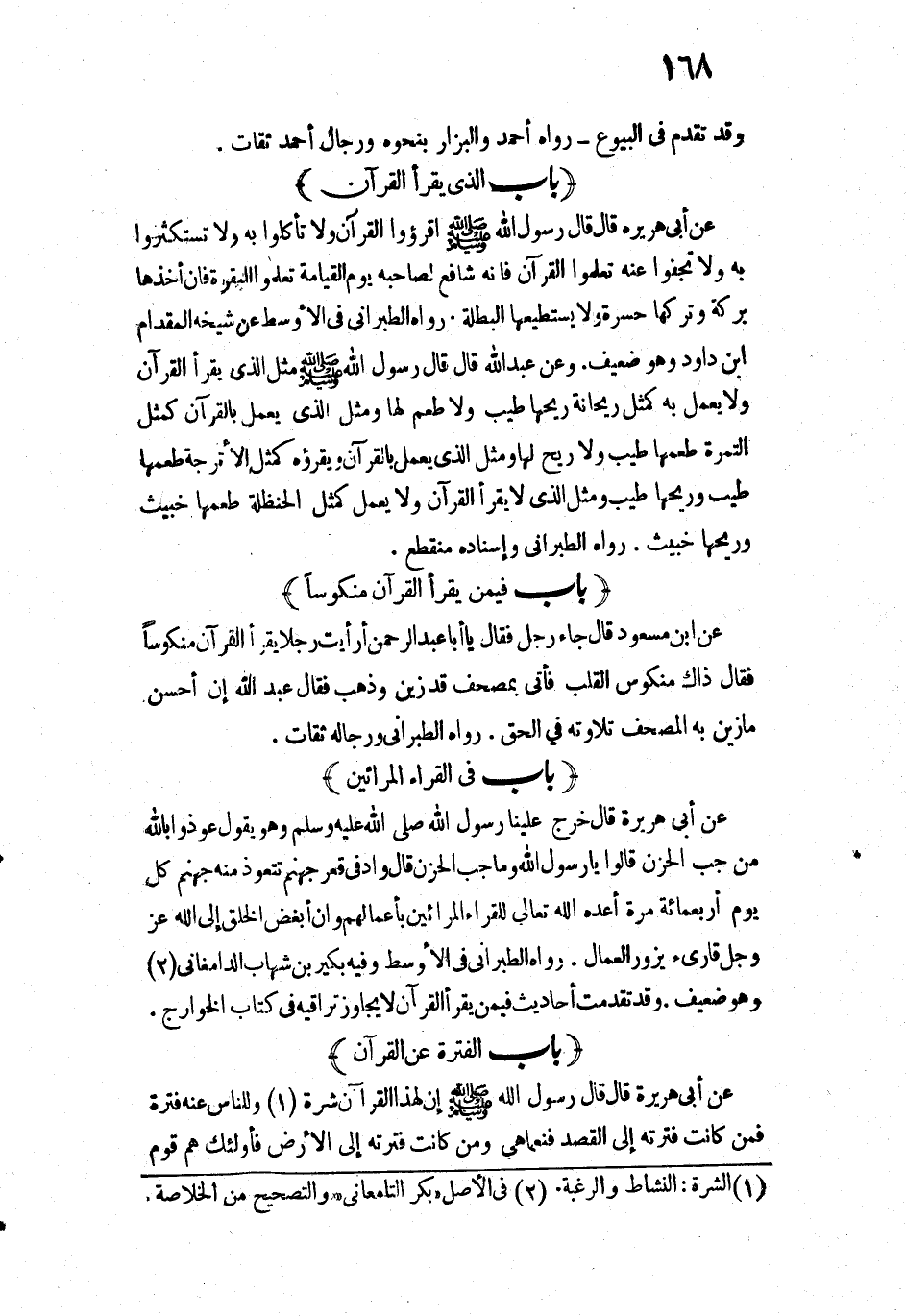 رَوَاهُ الطَّبَرَانِيُّ فِي الْأَوْسَطِ، وَفِيهِ بُكَيْرُ بْنُ شِهَابٍ الدَّامَغَانِيُّ وَهُوَ ضَعِيفٌ. وَقَدْ تَقَدَّمَتْ أَحَادِيثُ فِيمَنْ يَقْرَأُ الْقُرْآنَ لَا يُجَاوِزُ تَرَاقِيَهُ فِي كِتَابِ الْخَوَارِجِ.