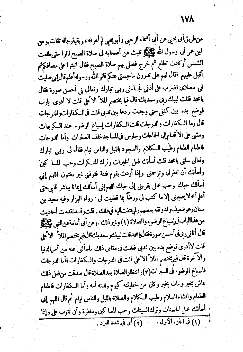 11743 - وَعَنِ ابْنِ عُمَرَ «أَنَّ رَسُولَ اللَّهِ - صَلَّى اللَّهُ عَلَيْهِ وَسَلَّمَ - تَلَبَّثَ عَنْ أَصْحَابِهِ فِي صَلَاةِ الصُّبْحِ حَتَّى قَالُوا: طَلَعَتِ الشَّمْسُ - أَوْ تَطْلُعُ - ثُمَّ خَرَجَ فَصَلَّى بِهِمْ صَلَاةَ الصُّبْحِ فَقَالَ: " اثْبُتُوا عَلَى مَصَافِّكُمْ ". ثُمَّ أَقْبَلَ عَلَيْهِمْ، فَقَالَ لَهُمْ: " هَلْ تَدْرُونَ مَا حَبَسَنِي عَنْكُمْ؟ ". قَالُوا: اللَّهُ وَرَسُولُهُ أَعْلَمُ. قَالَ: " إِنِّي صَلَّيْتُ فِي مُصَلَّايَ فَضُرِبَ عَلَى أُذُنِي، فَجَاءَنِي رَبِّي - تَبَارَكَ وَتَعَالَى - فِي أَحْسَنِ صُورَةٍ، فَقَالَ: يَا مُحَمَّدُ، فَقُلْتُ: لَبَّيْكَ رَبِّي وَسَعْدَيْكَ. قَالَ: فِيمَ يَخْتَصِمُ الْمَلَأُ الْأَعْلَى؟ قُلْتُ: لَا أَدْرِي يَا رَبِّ. فَوَضَعَ يَدَهُ بَيْنَ كَتِفَيَّ حَتَّى وَجَدْتُ بَرْدَهَا بَيْنَ ثَدْيَيَّ، فَعَلِمْتُ مَا سَأَلَنِي عَنْهُ، ثُمَّ قَالَ: يَا مُحَمَّدُ، قُلْتُ: لَبَّيْكَ رَبِّي وَسَعْدَيْكَ. قَالَ: فِيمَ يَخْتَصِمُ الْمَلَأُ الْأَعْلَى؟ قُلْتُ: فِي الْكَفَّارَاتِ وَالدَّرَجَاتِ. قَالَ: وَمَا الْكَفَّارَاتُ وَالدَّرَجَاتُ؟ قُلْتُ: الْكَفَّارَاتُ: إِسْبَاعُ الْوُضُوءِ عِنْدَ الْكَرِيهَاتِ، وَمَشْيٌ عَلَى الْأَقْدَامِ إِلَى الْجَمَاعَاتِ، وَجُلُوسٌ فِي الْمَسَاجِدِ خَلْفَ الصَّلَوَاتِ، وَأَمَّا الدَّرَجَاتُ: فَإِطْعَامُ الطَّعَامِ، وَطِيبُ الْكَلَامِ، وَالسُّجُودُ بِاللَّيْلِ وَالنَّاسُ نِيَامٌ. فَقَالَ لِي رَبِّي - تَبَارَكَ وَتَعَالَى -: سَلْنِي يَا مُحَمَّدُ. قُلْتُ: أَسْأَلُكَ فِعْلَ الْخَيْرَاتِ، وَتَرْكَ الْمُنْكَرَاتِ، وَحُبَّ الْمَسَاكِينِ، وَأَسْأَلُكَ أَنْ تَغْفِرَ لِي وَتَرْحَمَنِي، وَإِذَا أَرَدْتَ بِقَوْمٍ فِتْنَةً فَتَوَفَّنِي غَيْرَ مَفْتُونٍ. اللَّهُمَّ إِنِّي أَسْأَلُكَ حُبَّكَ وَحُبَّ عَمَلٍ يُقَرِّبُنِي إِلَى حُبِّكَ. اللَّهُمَّ إِنِّي أَسْأَلُكَ إِيمَانًا يُبَاشِرُ قَلْبِي حَتَّى أَعْلَمَ أَنَّهُ لَا يُصِيبُنِي إِلَّا مَا كُتِبَ لِي، وَرِضًا بِمَا قَضَيْتَ لِي».