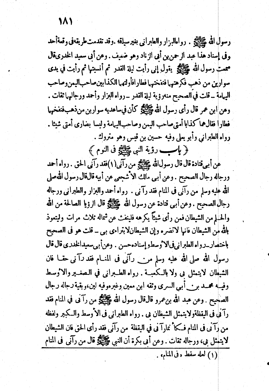 رَوَاهُ الطَّبَرَانِيُّ فِي الْأَوْسَطِ وَالْكَبِيرِ، وَلَفْظُهُ: «مَنْ رَآنِي فِي الْمَنَامِ فَكَأَنَّمَا رَآنِي فِي الْيَقَظَةِ، مَنْ رَآنِي فَقَدْ رَأَى الْحَقَّ، فَإِنَّ الشَّيْطَانَ لَا يَتَمَثَّلُ بِي»، وَرِجَالُهُ ثِقَاتٌ.