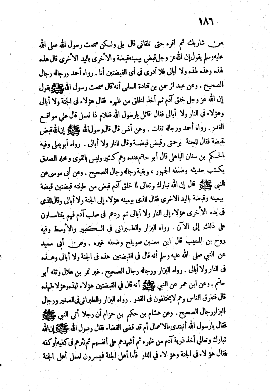 11783 - وَعَنِ ابْنِ عُمَرَ، «عَنِ النَّبِيِّ - صَلَّى اللَّهُ عَلَيْهِ وَسَلَّمَ - أَنَّهُ قَالَ فِي الْقَبْضَتَيْنِ: " هَؤُلَاءِ لِهَذِهِ وَهَؤُلَاءِ لِهَذِهِ "، قَالَ: فَتَفَرَّقَ النَّاسُ وَهُمْ لَا يَخْتَلِفُونَ فِي الْقَدَرِ».