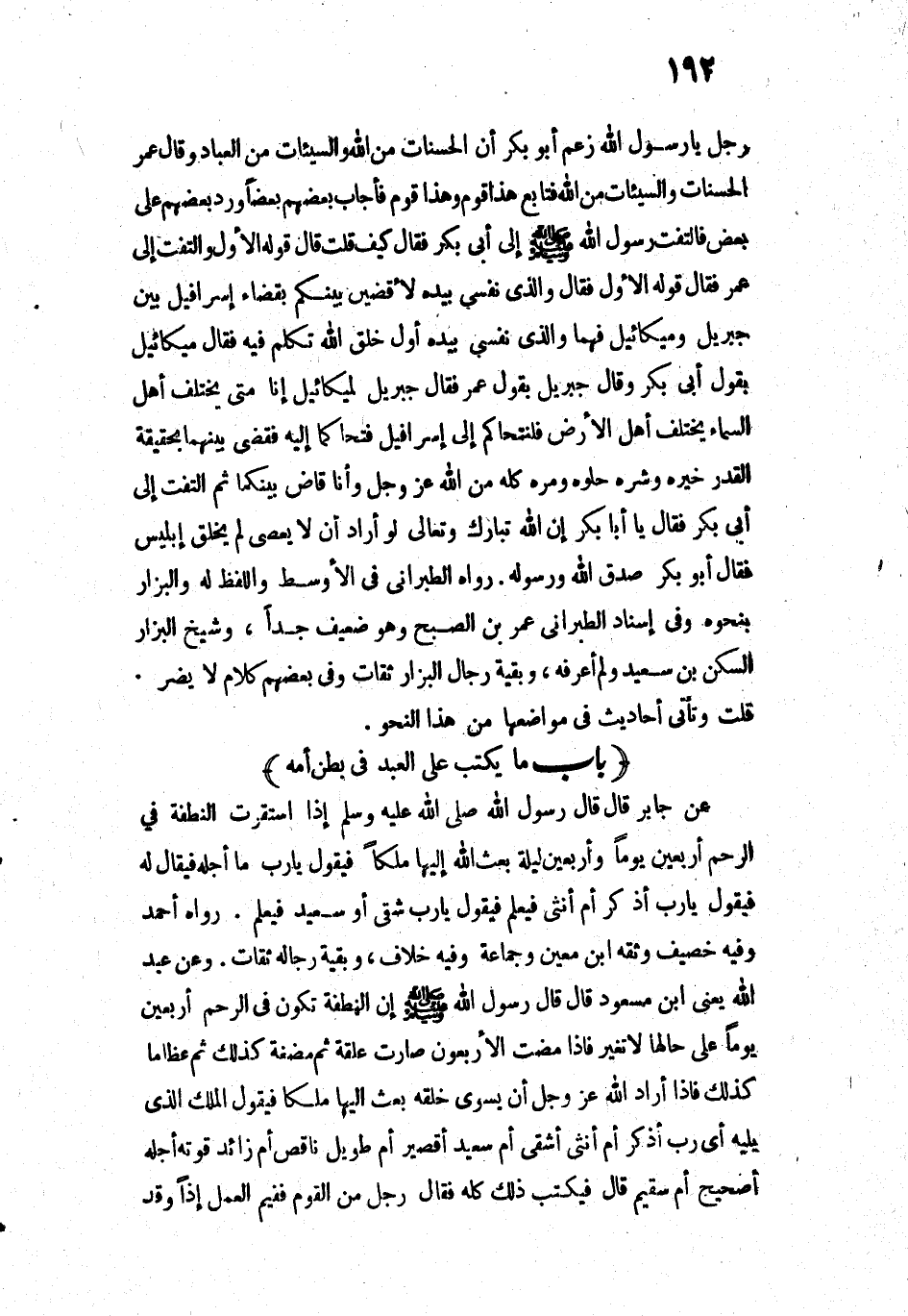 رَجُلٌ: يَا رَسُولَ اللَّهِ، زَعَمَ أَبُو بَكْرٍ أَنَّ الْحَسَنَاتِ مِنَ اللَّهِ وَالسَّيِّئَاتِ مِنَ الْعِبَادِ، وَقَالَ عُمَرُ: الْحَسَنَاتُ وَالسَّيِّئَاتُ مِنَ اللَّهِ، فَتَابَعَ هَذَا قَوْمٌ وَهَذَا قَوْمٌ، فَأَجَابَ بَعْضُهُمْ بَعْضًا وَرَدَّ بَعْضُهُمْ عَلَى بَعْضٍ، فَالْتَفَتَ رَسُولُ اللَّهِ - صَلَّى اللَّهُ عَلَيْهِ وَسَلَّمَ - إِلَى أَبِي بَكْرٍ فَقَالَ: " كَيْفَ قُلْتَ؟ "، قَالَ قَوْلَهُ الْأَوَّلَ، وَالْتَفَتَ إِلَى عُمَرَ، فَقَالَ قَوْلَهُ الْأَوَّلَ، فَقَالَ: " وَالَّذِي نَفْسِي بِيَدِهِ، لَأَقْضِيَنَّ بَيْنَكُمْ بِقَضَاءِ إِسْرَافِيلَ بَيْنَ جِبْرِيلَ وَمِيكَائِيلَ، فَهُمَا وَالَّذِي نَفْسِي بِيَدِهِ أَوَّلُ خَلْقِ اللَّهِ تَكَلَّمَ فِيهِ، فَقَالَ مِيكَائِيلُ بِقَوْلِ أَبِي بَكْرٍ، وَقَالَ جِبْرِيلُ بِقَوْلِ عُمَرَ، فَقَالَ جِبْرِيلُ لِمِيكَائِيلَ: إِنَّا مَتَى يَخْتَلِفْ أَهْلُ السَّمَاءِ يَخْتَلِفْ أَهْلُ الْأَرْضِ فَلْنَتَحَاكَمْ إِلَى إِسْرَافِيلَ، فَتَحَاكَمَا إِلَيْهِ فَقَضَى بَيْنَهُمَا بِحَقِيقَةِ الْقَدَرِ خَيْرِهِ وَشَرِّهِ حُلْوِهِ وَمُرِّهِ، كُلُّهُ مِنَ اللَّهِ - عَزَّ وَجَلَّ - وَأَنَا قَاضٍ بَيْنَكُمَا "، ثُمَّ الْتَفَتَ إِلَى أَبِي بَكْرٍ فَقَالَ: " يَا أَبَا بَكْرٍ، إِنَّ اللَّهَ - تَبَارَكَ وَتَعَالَى - لَوْ أَرَادَ أَنْ لَا يُعْصَى لَمْ يَخْلُقْ إِبْلِيسَ "، فَقَالَ أَبُو بَكْرٍ: صَدَقَ اللَّهُ وَرَسُولُهُ».