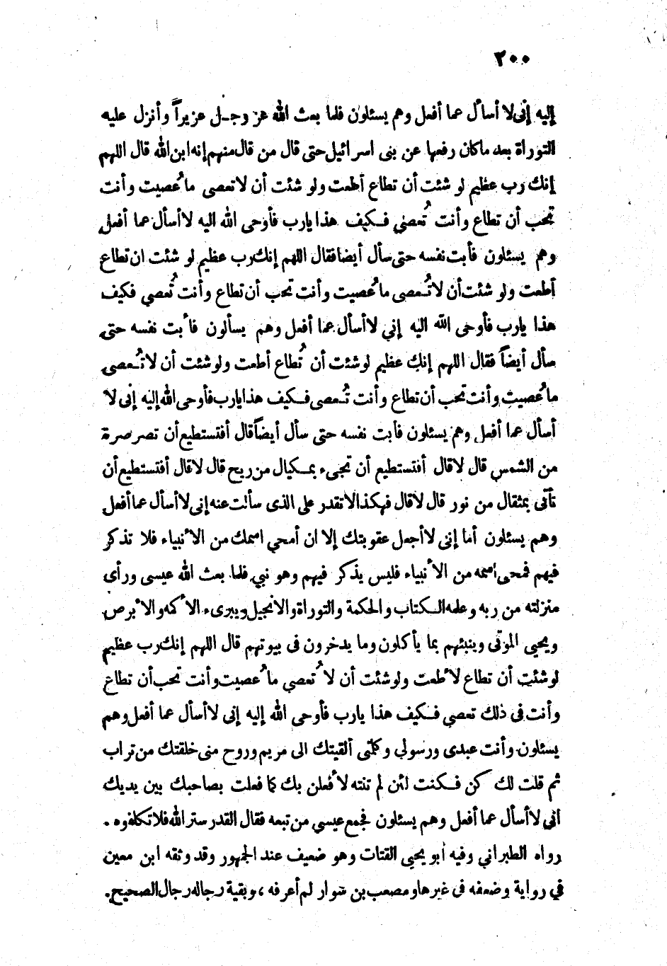 إِلَيْهِ: إِنِّي لَا أُسْأَلُ عَمَّا أَفْعَلُ وَهُمْ يُسْأَلُونَ [فَانْتَهَى مُوسَى - عَلَيْهِ السَّلَامُ]، فَلَمَّا بَعَثَ اللَّهُ - عَزَّ وَجَلَّ - عُزَيْرًا، وَأَنْزَلَ عَلَيْهِ التَّوْرَاةَ بَعْدَمَا كَانَ رَفَعَهَا عَنْ بَنِي إِسْرَائِيلَ حَتَّى قَالَ مَنْ قَالَ مِنْهُمْ: إِنَّهُ ابْنُ اللَّهِ، قَالَ: اللَّهُمَّ إِنَّكَ رَبٌّ عَظِيمٌ، لَوْ شِئْتَ أَنْ تُطَاعَ أُطِعْتَ، وَلَوْ شِئْتَ أَنْ لَا تُعْصَى مَا عُصِيتَ، وَأَنْتَ تُحِبُّ أَنْ تُطَاعَ وَأَنْتَ [فِي ذَلِكَ] تُعْصَى، فَكَيْفَ هَذَا يَا رَبِّ؟ فَأَوْحَى اللَّهُ إِلَيْهِ: لَا أُسْأَلُ عَمَّا أَفْعَلُ وَهُمْ يُسْأَلُونَ، فَأَبَتْ نَفْسُهُ حَتَّى سَأَلَ أَيْضًا، فَقَالَ: اللَّهُمَّ إِنَّكَ رَبٌّ عَظِيمٌ، لَوْ شِئْتَ أَنْ تُطَاعَ أُطِعْتَ، وَلَوْ شِئْتَ أَنْ لَا تُعْصَى مَا عُصِيتَ، وَأَنْتَ تُحِبُّ أَنْ تُطَاعَ وَأَنْتَ تُعْصَى، فَكَيْفَ هَذَا يَا رَبِّ؟ فَأَوْحَى اللَّهُ إِلَيْهِ: إِنِّي لَا أُسْأَلُ عَمَّا أَفْعَلُ وَهُمْ يُسْأَلُونَ، فَأَبَتْ نَفْسُهُ حَتَّى سَأَلَ أَيْضًا، فَقَالَ: اللَّهُمَّ إِنَّكَ عَظِيمٌ، لَوْ شِئْتَ أَنْ تُطَاعَ أُطِعْتَ، وَلَوْ شِئْتَ أَنْ لَا تُعْصَى مَا عُصِيتَ، وَأَنْتَ تُحِبُّ أَنْ تُطَاعَ وَأَنْتَ تُعْصَى، فَكَيْفَ هَذَا يَا رَبِّ؟ فَأَوْحَى اللَّهُ إِلَيْهِ: إِنِّي لَا أُسْأَلُ عَمَّا أَفْعَلُ وَهُمْ يُسْأَلُونَ، فَأَبَتْ نَفْسُهُ حَتَّى سَأَلَ أَيْضًا، قَالَ: أَفَتَسْتَطِيعُ أَنْ تَصِرَّ صُرَّةً مِنَ الشَّمْسِ؟ قَالَ: لَا، قَالَ: أَفَتَسْتَطِيعُ أَنْ تَجِيءَ بِمِكْيَالٍ مِنْ رِيحٍ؟ قَالَ: لَا، قَالَ: أَفَتَسْتَطِيعُ أَنْ تَأْتِيَ بِمِثْقَالٍ مِنْ نُورٍ؟ قَالَ: لَا، قَالَ: فَهَكَذَا لَا تَقْدِرُ عَلَى الَّذِي سَأَلْتَ عَنْهُ، إِنِّي لَا أُسْأَلُ عَمَّا أَفْعَلُ وَهُمْ يُسْأَلُونَ، أَمَا إِنِّي لَا أَجْعَلُ عُقُوبَتَكَ إِلَّا أَنْ أَمْحِيَ اسْمَكَ مِنَ الْأَنْبِيَاءِ فَلَا تُذْكَرُ فِيهِمْ، فَمَحَى اسْمَهُ مِنَ الْأَنْبِيَاءِ فَلَيْسَ يُذْكَرُ فِيهِمْ وَهُوَ نَبِيٌّ، فَلَمَّا بَعَثَ اللَّهُ عِيسَى، وَرَأَى مَنْزِلَتَهُ مِنْ رَبِّهِ، وَعَلَّمَهُ الْكِتَابَ وَالْحِكْمَةَ وَالتَّوْرَاةَ وَالْإِنْجِيلَ، وَيُبْرِئُ الْأَكْمَهَ وَالْأَبْرَصَ، وَيُحْيِي الْمَوْتَى، وَيُنَبِّئُهُمْ بِمَا يَأْكُلُونَ وَمَا يَدَّخِرُونَ فِي بُيُوتِهِمْ، قَالَ: اللَّهُمَّ إِنَّكَ رَبٌّ عَظِيمٌ، لَوْ شِئْتَ أَنْ تُطَاعَ لَأُطِعْتَ، وَلَوْ شِئْتَ أَنْ لَا تُعْصَى مَا عُصِيتَ، وَأَنْتَ تُحِبُّ أَنْ تُطَاعَ وَأَنْتَ فِي ذَلِكَ تُعْصَى، فَكَيْفَ هَذَا يَا رَبِّ؟ فَأَوْحَى اللَّهُ إِلَيْهِ: إِنِّي لَا أُسْأَلُ عَمَّا أَفْعَلُ وَهُمْ يُسْأَلُونَ، وَأَنْتَ عَبْدِي وَرَسُولِي، وَكَلِمَتِي أَلْقَيْتُكَ إِلَى مَرْيَمَ، وَرُوحٌ مِنِّي، خَلَقْتُكَ مِنْ تُرَابٍ، ثُمَّ قُلْتُ لَكَ: كُنْ فَكُنْتَ، لَئِنْ لَمْ تَنْتَهِ لَأَفْعَلَنَّ بِكَ كَمَا فَعَلْتُ بِصَاحِبِكَ بَيْنَ يَدَيْكَ، إِنِّي لَا أُسْأَلُ عَمَّا أَفْعَلُ وَهُمْ يُسْأَلُونَ، فَجَمَعَ عِيسَى مَنْ تَبِعَهُ، فَقَالَ: الْقَدَرُ سِتْرُ اللَّهِ فَلَا تَكَلَّفُوهُ.
