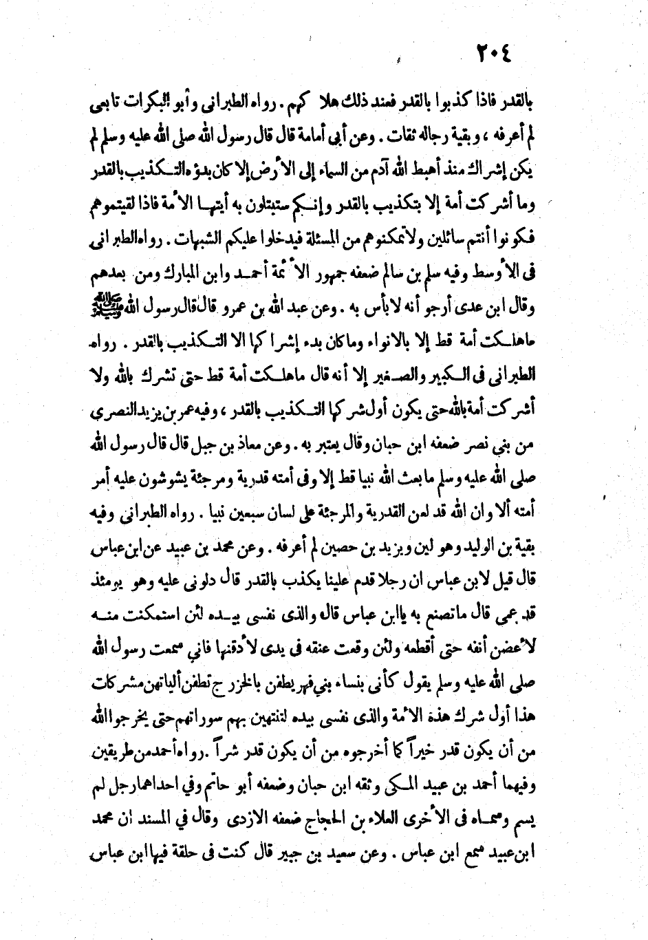 رَوَاهُ الطَّبَرَانِيُّ فِي الْكَبِيرِ وَالصَّغِيرِ، إِلَّا أَنَّهُ قَالَ: " «مَا هَلَكَتْ أُمَّةٌ قَطُّ حَتَّى تُشْرِكَ بِاللَّهِ، وَلَا أَشْرَكَتْ أُمَّةٌ بِاللَّهِ حَتَّى يَكُونَ أَوَّلُ شِرْكِهَا التَّكْذِيبَ بِالْقَدَرِ» ".