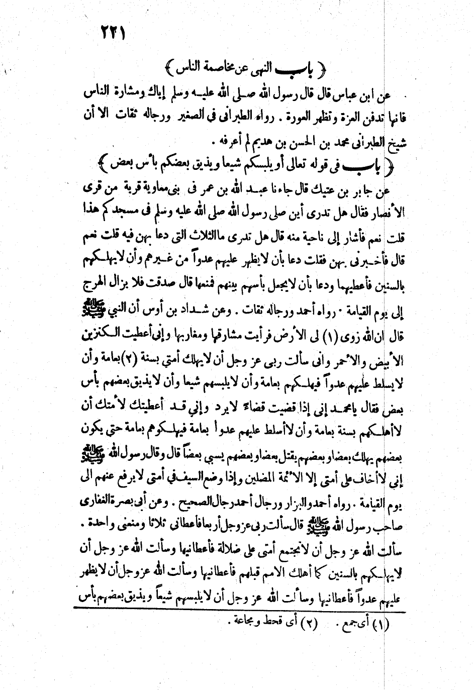 11964 - عَنْ جَابِرِ بْنِ عَتِيكٍ قَالَ: «جَاءَنَا عَبْدُ اللَّهِ بْنُ عُمَرَ فِي بَنِي مُعَاوِيَةَ - قَرْيَةٌ مِنْ قُرَى الْأَنْصَارِ - فَقَالَ: هَلْ تَدْرِي أَيْنَ صَلَّى رَسُولُ اللَّهِ - صَلَّى اللَّهُ عَلَيْهِ وَسَلَّمَ - فِي مَسْجِدِكُمْ هَذَا؟ قُلْتُ: نَعَمْ. فَأَشَارَ إِلَى نَاحِيَةٍ مِنْهُ، قَالَ: هَلْ تَدْرِي مَا الثَّلَاثُ الَّتِي دَعَا بِهِنَّ فِيهِ؟ قُلْتُ: نَعَمْ. قَالَ: فَأَخْبِرْنِي بِهِنَّ. فَقُلْتُ: دَعَا " بِأَنْ لَا يُظْهِرَ عَلَيْهِمْ عَدُوًّا مِنْ غَيْرِهِمْ، وَأَنْ لَا يُهْلِكَهُمْ بِالسِّنِينَ ". فَأُعْطِيهِمَا. وَدَعَا " بِأَنْ لَا يُجْعَلَ بَأْسُهُمْ بَيْنَهُمْ". فَمُنِعَهَا. قَالَ: صَدَقْتَ. فَلَا يَزَالُ الْهَرْجُ إِلَى يَوْمِ الْقِيَامَةِ».