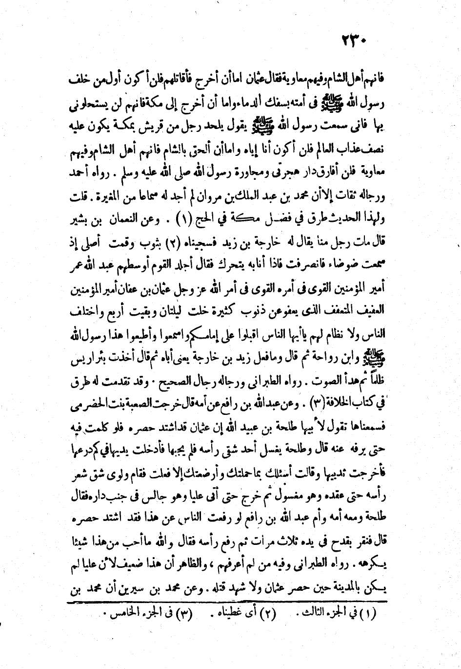 فَإِنَّهُمْ أَهْلُ الشَّامِ وَفِيهِمْ مُعَاوِيَةُ. فَقَالَ عُثْمَانُ: أَمَّا أَنْ أَخْرُجَ فَأُقَاتِلَهُمْ فَلَنْ أَكُونَ أَوَّلَ مَنْ خَلَفَ رَسُولَ اللَّهِ - صَلَّى اللَّهُ عَلَيْهِ وَسَلَّمَ - فِي أُمَّتِهِ بِسَفْكِ الدِّمَاءِ، وَأَمَّا أَنْ أَخْرُجَ إِلَى مَكَّةَ فَإِنَّهُمْ لَنْ يَسْتَحِلُّونِي بِهَا، فَإِنِّي سَمِعْتُ رَسُولَ اللَّهِ - صَلَّى اللَّهُ عَلَيْهِ وَسَلَّمَ - يَقُولُ: " «يُلْحِدُ رَجُلٌ مِنْ قُرَيْشٍ بِمَكَّةَ يَكُونُ عَلَيْهِ نِصْفُ عَذَابِ الْعَالَمِ» " فَلَنْ أَكُونَ أَنَا إِيَّاهُ، وَأَمَّا أَنْ أَلْحَقَ بِالشَّامِ فَإِنَّهُمْ أَهْلُ الشَّامِ وَفِيهِمْ مُعَاوِيَةُ فَلَنْ أُفَارِقَ دَارَ هِجْرَتِي وَمُجَاوَرَةَ رَسُولِ اللَّهِ - صَلَّى اللَّهُ عَلَيْهِ وَسَلَّمَ.