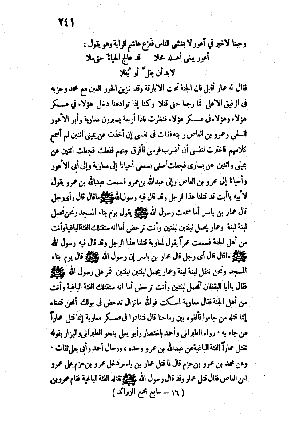 رَوَاهُ الطَّبَرَانِيُّ، وَأَحْمَدُ بِاخْتِصَارٍ، وَأَبُو يَعْلَى بِنَحْوِ الطَّبَرَانِيِّ، وَالْبَزَّارُ بِقَوْلِهِ: " تَقْتُلُ «عَمَّارًا الْفِئَةُ الْبَاغِيَةُ» " عَنْ عَبْدِ اللَّهِ بْنِ عَمْرٍو وَحْدَهُ، وَرِجَالُ أَحْمَدَ، وَأَبِي يَعْلَى ثِقَاتٌ.