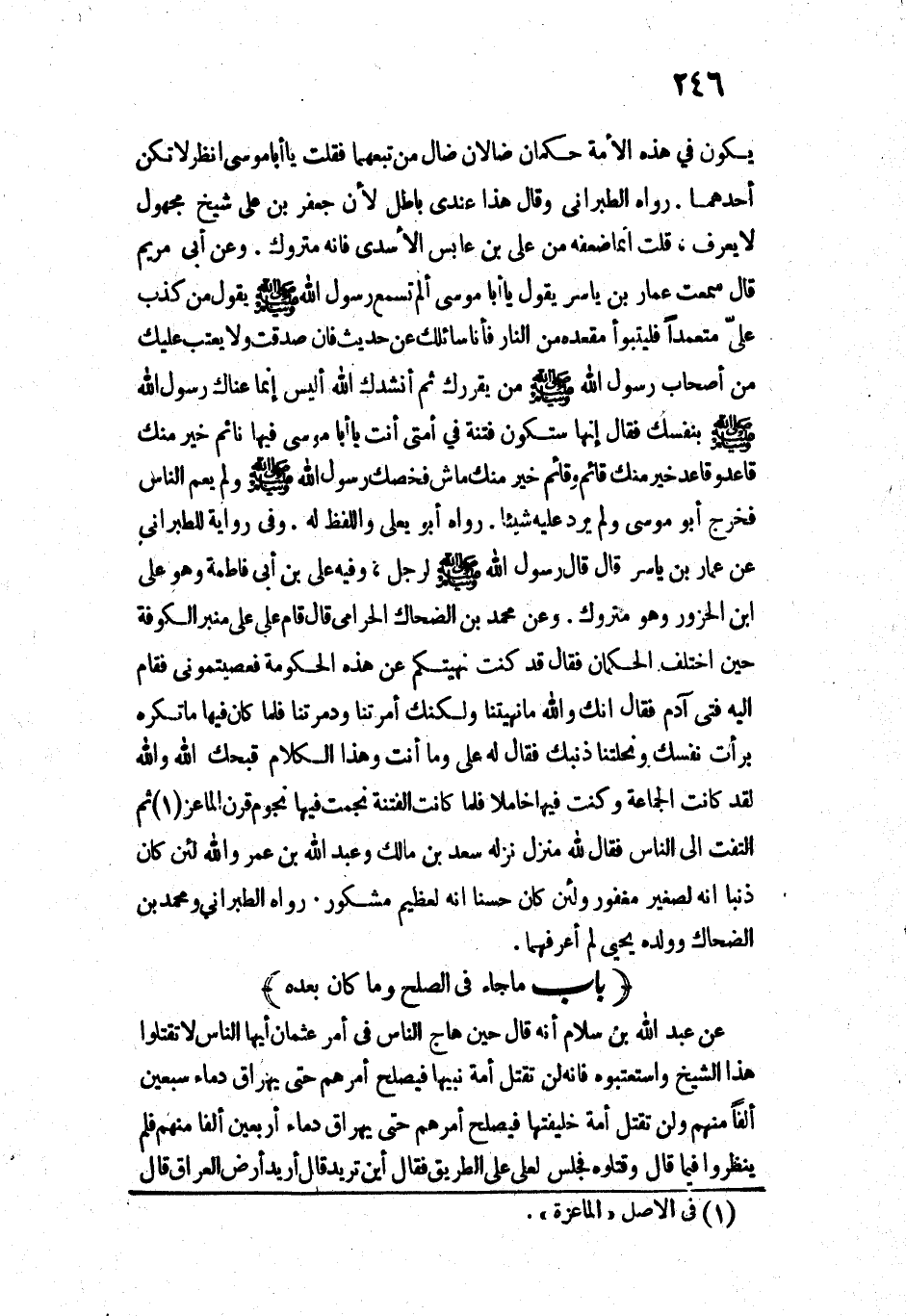 12072 - وَعَنْ مُحَمَّدِ بْنِ الضَّحَّاكِ الْحَرَامِيِّ قَالَ: قَامَ عَلِيٌّ عَلَى مِنْبَرِ الْكُوفَةِ حِينَ اخْتَلَفَ الْحَكَمَانِ، فَقَالَ: قَدْ كُنْتُ نَهَيْتُكُمْ عَنْ هَذِهِ الْحُكُومَةِ فَعَصَيْتُمُونِي. فَقَامَ إِلَيْهِ فَتًى آدَمُ فَقَالَ: إِنَّكَ وَاللَّهِ مَا نَهَيْتَنَا، وَلَكِنَّكَ أَمَرْتَنَا وَدَمَّرْتَنَا، فَلَمَّا كَانَ فِيهَا مَا تَكْرَهُ بَرَّأْتَ نَفْسَكَ وَنَحَلْتَنَا ذَنْبَكَ. فَقَالَ لَهُ عَلِيٌّ: وَمَا أَنْتَ وَهَذَا الْكَلَامُ؟ قَبَّحَكَ اللَّهُ، وَاللَّهِ لَقَدْ كَانَتِ الْجَمَاعَةُ وَكُنْتَ فِيهَا خَامِلًا، فَلَمَّا كَانَتِ الْفِتْنَةُ نَجَمَتْ فِيهَا نُجُومُ قَرْنِ الْمَاعِزَةِ، ثُمَّ الْتَفَتَ إِلَى النَّاسِ فَقَالَ: لِلَّهِ مَنْزِلٌ نَزَلَهُ سَعْدُ بْنُ مَالِكٍ وَعَبْدُ اللَّهِ بْنُ عُمَرَ، وَاللَّهِ لَئِنْ كَانَ ذَنْبًا إِنَّهُ لَصَغِيرٌ مَغْفُورٌ، وَلَئِنْ كَانَ حَسَنًا إِنَّهُ لَعَظِيمٌ مَشْكُورٌ.
