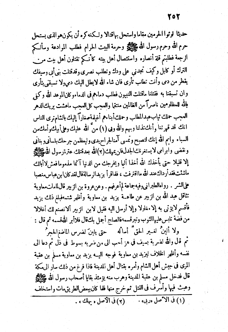 حَدِيثًا، لَوَّثُوا الْحَرَمَيْنِ مَقَامًا، وَاسْتَحَلَّ بِهَا قِتَالًا، وَلَكِنَّهُ كَرِهَ أَنْ يَكُونَ هُوَ الَّذِي يَسْتَحِلُّ [بِهِ] حَرَمَ اللَّهِ وَحَرَمَ رَسُولِ اللَّهِ - صَلَّى اللَّهُ عَلَيْهِ وَسَلَّمَ - وَحُرْمَةَ الْبَيْتِ الْحَرَامِ، [فَطَلَبَ إِلَيْكُمْ الْحُسَيْنُ الْمُوَادَعَةَ وَسَأَلَكُمُ الرَّجْعَةَ فَاغْتَنَمْتُمْ] قِلَّةَ أَنْصَارِهِ وَاسْتِئْصَالَ أَهْلِ بَيْتِهِ، كَأَنَّكُمْ تَقْتُلُونَ أَهْلَ بَيْتٍ مِنَ التُّرْكِ أَوْ كَابُلَ.