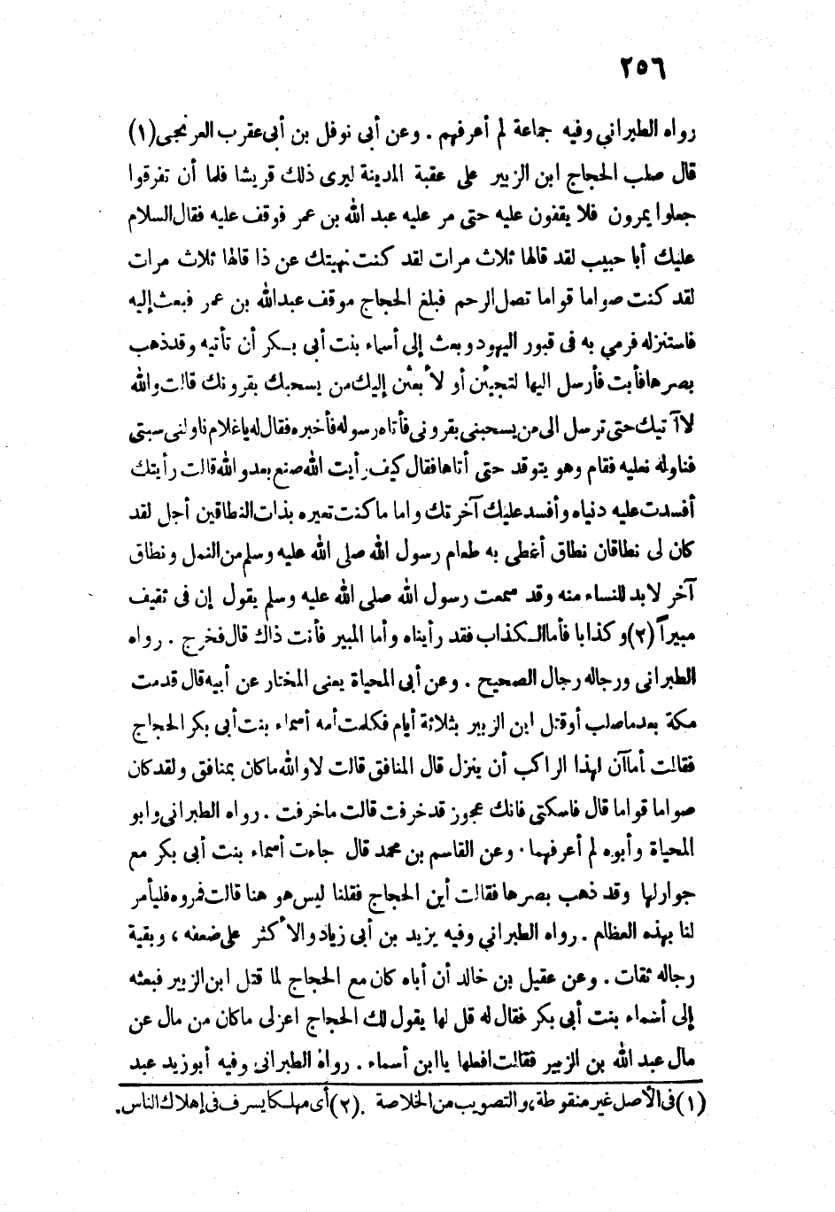 12086 - وَعَنْ أَبِي نَوْفَلِ بْنِ أَبِي عَقْرَبٍ الْعَرْنَجِيِّ قَالَ: صَلَبَ الْحَجَّاجُ ابْنَ الزُّبَيْرِ عَلَى عَقَبَةِ الْمَدِينَةِ لِيُرِيَ ذَلِكَ قُرَيْشًا، فَلَمَّا أَنْ تَفَرَّقُوا جَعَلُوا يَمُرُّونَ فَلَا يَقِفُونَ عَلَيْهِ، حَتَّى مَرَّ عَلَيْهِ عَبْدُ اللَّهِ بْنُ عُمَرَ فَوَقَفَ عَلَيْهِ فَقَالَ: السَّلَامُ عَلَيْكَ أَبَا خَبِيبٍ - لَقَدْ قَالَهَا ثَلَاثَ مَرَّاتٍ - لَقَدْ كُنْتُ نَهَيْتُكَ عَنْ ذَا - قَالَهَا ثَلَاثَ مَرَّاتٍ - لَقَدْ كُنْتَ صَوَّامًا قَوَّامًا، تَصِلُ الرَّحِمَ. فَبَلَغَ الْحَجَّاجَ مَوْقِفُ عَبْدِ اللَّهِ بْنِ عُمَرَ، فَبَعَثَ إِلَيْهِ، فَاسْتَنْزَلَهُ، فَرَمَى بِهِ فِي قُبُورِ الْيَهُودِ، وَبَعَثَ إِلَى أَسْمَاءَ بِنْتِ أَبِي بَكْرٍ أَنْ تَأْتِيَهُ، وَقَدْ ذَهَبَ بَصَرُهَا، فَأَبَتْ. فَأَرْسَلَ إِلَيْهَا: لَتَجِيئِنَّ أَوْ لَأَبْعَثَنَّ إِلَيْكِ مَنْ يَسْحَبُكِ بِقُرُونِكِ. قَالَتْ: لَا وَاللَّهِ، لَا آتِيكَ حَتَّى تُرْسِلَ إِلَيَّ مَنْ يَسْحَبُنِي بِقُرُونِي. فَأَتَاهُ رَسُولُهُ فَأَخْبَرَهُ، فَقَالَ لَهُ: يَا غُلَامُ، نَاوِلْنِي سَبْتَيَّ، فَنَاوَلَهُ نَعْلَيْهِ، فَقَامَ وَهُوَ يَتَّقِدُ حَتَّى أَتَاهَا، فَقَالَ: كَيْفَ رَأَيْتِ اللَّهَ صَنَعَ بِعَدُوِّ اللَّهِ؟ قَالَتْ: رَأَيْتُكَ أَفْسَدْتَ عَلَيْهِ دُنْيَاهُ، وَأَفْسَدَ عَلَيْكَ آخِرَتَكَ، وَأَمَّا مَا كُنْتَ تُعَيِّرُهُ بِذَاتِ النِّطَاقَيْنِ، أَجَلْ، لَقَدْ كَانَ لِي نِطَاقَانِ، نِطَاقٌ أُغَطِّي بِهِ طَعَامَ رَسُولِ اللَّهِ - صَلَّى اللَّهُ عَلَيْهِ وَسَلَّمَ - مِنَ النَّمْلِ، وَنِطَاقٌ آخَرُ لَا بُدَّ لِلنِّسَاءِ مِنْهُ، وَقَدْ سَمِعْتُ رَسُولَ اللَّهِ - صَلَّى اللَّهُ عَلَيْهِ وَسَلَّمَ - يَقُولُ: " «إِنَّ فِي ثَقِيفٍ مُبِيرًا وَكَذَّابًا» ". فَأَمَّا الْكَذَّابُ فَقَدْ رَأَيْنَاهُ، وَأَمَّا الْمُبِيرُ فَأَنْتَ ذَاكَ. قَالَ: فَخَرَجَ.