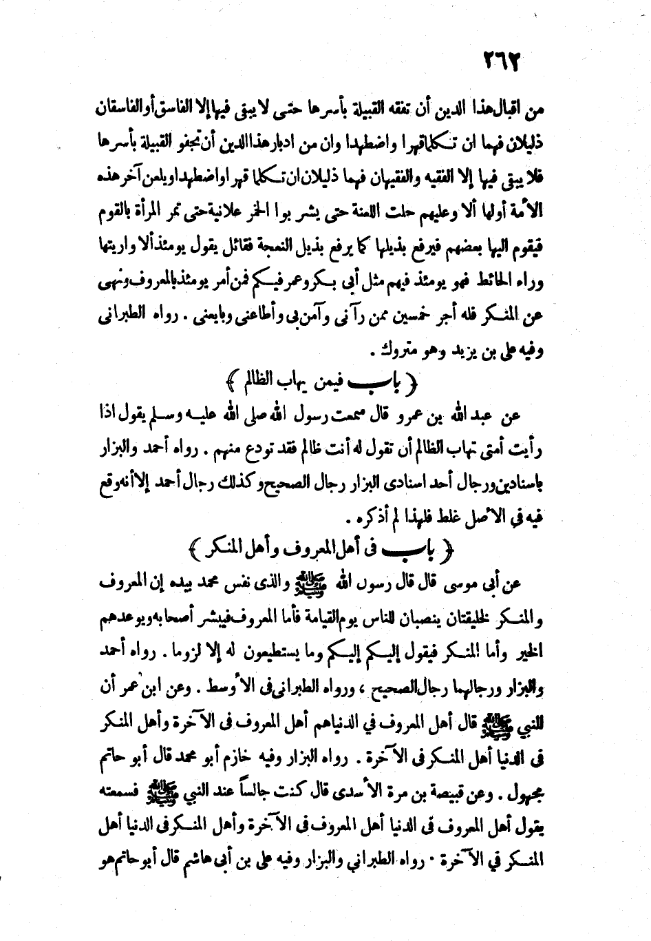 مِنْ إِقْبَالِ هَذَا الدِّينِ أَنْ تَفْقَهَ الْقَبِيلَةُ بِأَسْرِهَا حَتَّى لَا يَبْقَى فِيهَا إِلَّا الْفَاسِقُ أَوِ الْفَاسِقَانِ ذَلِيلَانِ، فَهُمَا إِنْ تَكَلَّمَا قُهِرَا وَاضْطُهِدَا. وَإِنَّ مِنْ إِدْبَارِ هَذَا الدِّينِ أَنْ تَجْفُوَ الْقَبِيلَةُ بِأَسْرِهَا فَلَا يَبْقَى فِيهَا إِلَّا الْفَقِيهُ وَالْفَقِيهَانِ، فَهُمَا ذَلِيلَانِ إِنْ تَكَلَّمَا قُهِرَا وَاضْطُهِدَا. وَيَلْعَنُ آخِرُ هَذِهِ الْأُمَّةِ أَوَّلَهَا، أَلَا وَعَلَيْهِمْ حَلَّتِ اللَّعْنَةُ حَتَّى يَشْرَبُوا الْخَمْرَ عَلَانِيَةً حَتَّى تَمُرَّ الْمَرْأَةُ بِالْقَوْمِ فَيَقُومَ إِلَيْهَا بَعْضُهُمْ فَيَرْفَعُ بِذَيْلِهَا كَمَا يَرْفَعُ بِذَنْبٍ النَّعْجَةِ، فَقَائِلٌ يَقُولُ يَوْمَئِذٍ: أَلَا وَارَيْتَهَا وَرَاءَ الْحَائِطِ، فَهُوَ يَوْمَئِذٍ فِيهِمْ مِثْلُ أَبِي بَكْرٍ وَعُمَرَ فِيكُمْ، فَمَنْ أَمَرَ يَوْمَئِذٍ بِالْمَعْرُوفِ وَنَهَى عَنِ الْمُنْكَرِ فَلَهُ أَجْرُ خَمْسِينَ مِمَّنْ رَآنِي وَآمَنَ بِي وَأَطَاعَنِي وَبَايَعَنِي» ".