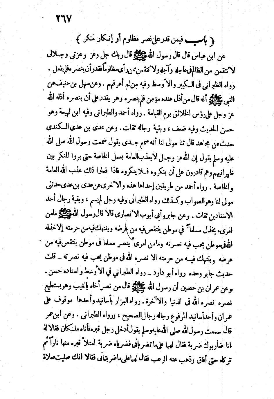 12135 - عَنِ ابْنِ عَبَّاسٍ قَالَ: قَالَ رَسُولُ اللَّهِ - صَلَّى اللَّهُ عَلَيْهِ وَسَلَّمَ: " «قَالَ رَبُّكَ - جَلَّ وَعَزَّ -: وَعِزَّتِي وَجَلَالِي لَأَنْتَقِمَنَّ مِنَ الظَّالِمِ فِي عَاجِلِهِ وَآجِلِهِ، وَلَأَنْتَقِمَنَّ مِمَّنْ رَأَى مَظْلُومًا فَقَدَرَ أَنْ يَنْصُرَهُ فَلَمْ يَفْعَلْ» ".