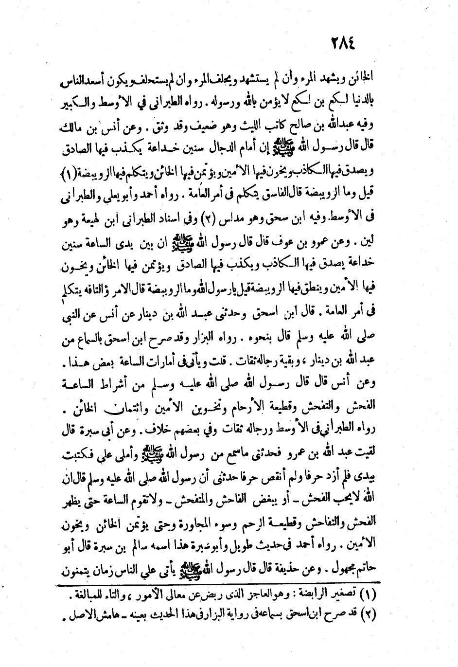 12227 - وَعَنْ عَمْرِو بْنِ عَوْفٍ قَالَ: قَالَ رَسُولُ اللَّهِ - صَلَّى اللَّهُ عَلَيْهِ وَسَلَّمَ: " «إِنَّ بَيْنَ يَدَيِ السَّاعَةِ سِنِينَ خَدَّاعَةً، يُصَدَّقُ فِيهَا الْكَاذِبُ، وَيُكَذَّبُ فِيهَا الصَّادِقُ، وَيُؤْتَمَنُ فِيهَا الْخَائِنُ، وَيُخَوَّنُ فِيهَا الْأَمِينُ، وَيَنْطِقُ فِيهَا الرُّوَيْبِضَةُ ". قِيلَ: يَا رَسُولَ اللَّهِ، وَمَا الرُّوَيْبِضَةُ؟ قَالَ: " الِامْرُؤُ التَّافِهُ يَتَكَلَّمُ فِي أَمْرِ الْعَامَّةِ» ".