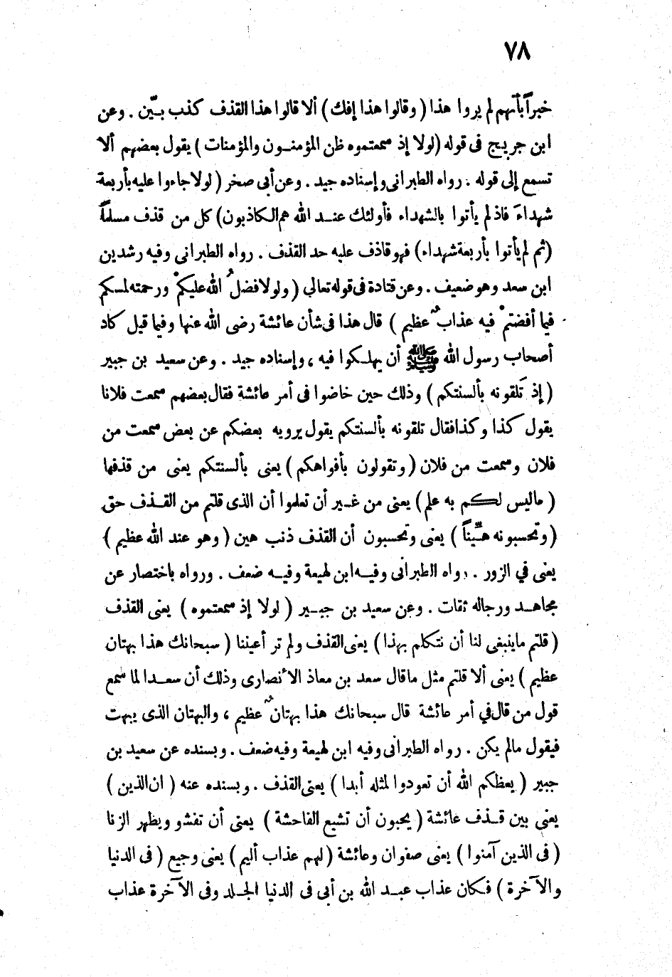 11204 - وَعَنْ سَعِيدِ بْنِ جُبَيْرٍ {إِذْ تَلَقَّوْنَهُ بِأَلْسِنَتِكُمْ} [النور: 15] وَذَلِكَ حِينَ خَاضُوا فِي أَمْرِ عَائِشَةَ فَقَالَ بَعْضُهُمْ: سَمِعْتُ فُلَانًا يَقُولُ كَذَا وَكَذَا فَقَالَ: تَلَقَّوْنَهُ بِأَلْسِنَتِكُمْ يَقُولُ: يَرْوِيهِ بَعْضُكُمْ عَنْ بَعْضٍ، سَمِعْتُ مِنْ فُلَانٍ وَسَمِعْتُ مِنْ فُلَانٍ وَتَقُولُونَ بِأَفْوَاهِكُمْ يَعْنِي بِأَلْسِنَتِكُمْ، يَعْنِي مَنْ قَذَفَهَا مَا لَيْسَ لَكُمْ بِهِ عِلْمٌ يَعْنِي مِنْ غَيْرِ أَنْ تَعْلَمُوا أَنَّ الَّذِي قُلْتُمْ مِنَ الْقَذْفِ حَقٌّ وَتَحْسَبُونَهُ هَيِّنًا يَعْنِي وَتَحْسَبُونَ أَنَّ الْقَذْفَ ذَنْبٌ هَيِّنٌ وَهُوَ عِنْدَ اللَّهِ عَظِيمٌ يَعْنِي فِي الزُّورِ.