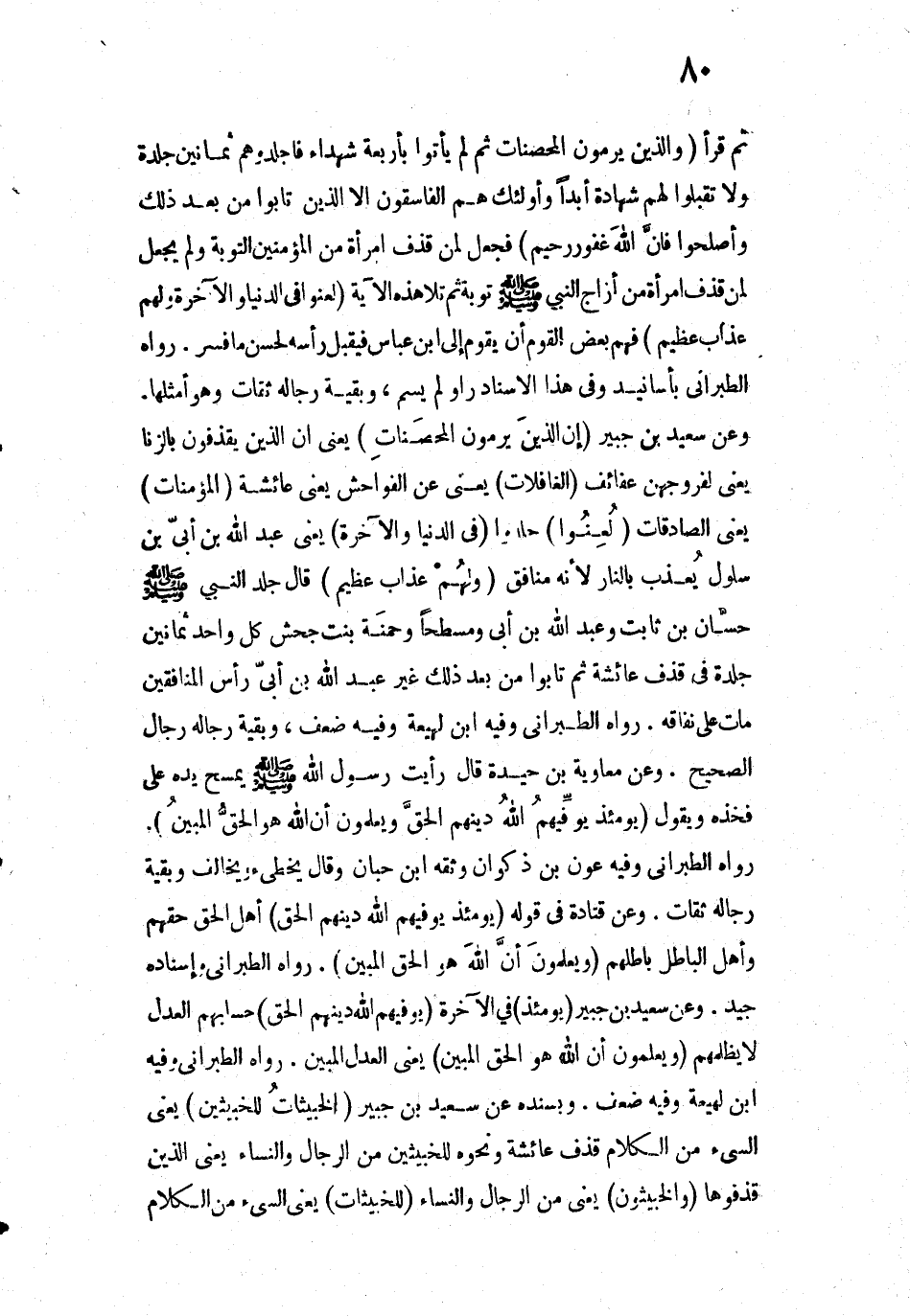 ثُمَّ قَرَأَ: {وَالَّذِينَ يَرْمُونَ الْمُحْصَنَاتِ ثُمَّ لَمْ يَأْتُوا بِأَرْبَعَةِ شُهَدَاءَ فَاجْلِدُوهُمْ ثَمَانِينَ جَلْدَةً وَلَا تَقْبَلُوا لَهُمْ شَهَادَةً أَبَدًا وَأُولَئِكَ هُمُ الْفَاسِقُونَ - إِلَّا الَّذِينَ تَابُوا مِنْ بَعْدِ ذَلِكَ وَأَصْلَحُوا فَإِنَّ اللَّهَ غَفُورٌ رَحِيمٌ} [النور: 4 - 5] فَجَعَلَ لِمَنْ قَذَفَ امْرَأَةً مِنَ الْمُؤْمِنِينَ التَّوْبَةَ، وَلَمْ يَجْعَلْ لِمَنْ قَذَفَ امْرَأَةً مِنْ أَزْوَاجِ النَّبِيِّ - صَلَّى اللَّهُ عَلَيْهِ وَسَلَّمَ - تَوْبَةً، ثُمَّ تَلَا هَذِهِ الْآيَةَ: لُعِنُوا فِي الدُّنْيَا وَالْآخِرَةِ وَلَهُمْ عَذَابٌ عَظِيمٌ. فَهَمَّ بَعْضُ الْقَوْمِ أَنْ يَقُومَ إِلَى ابْنِ عَبَّاسٍ فَيُقَبِّلَ رَأْسَهُ لِحُسْنِ مَا فَسَّرَ.