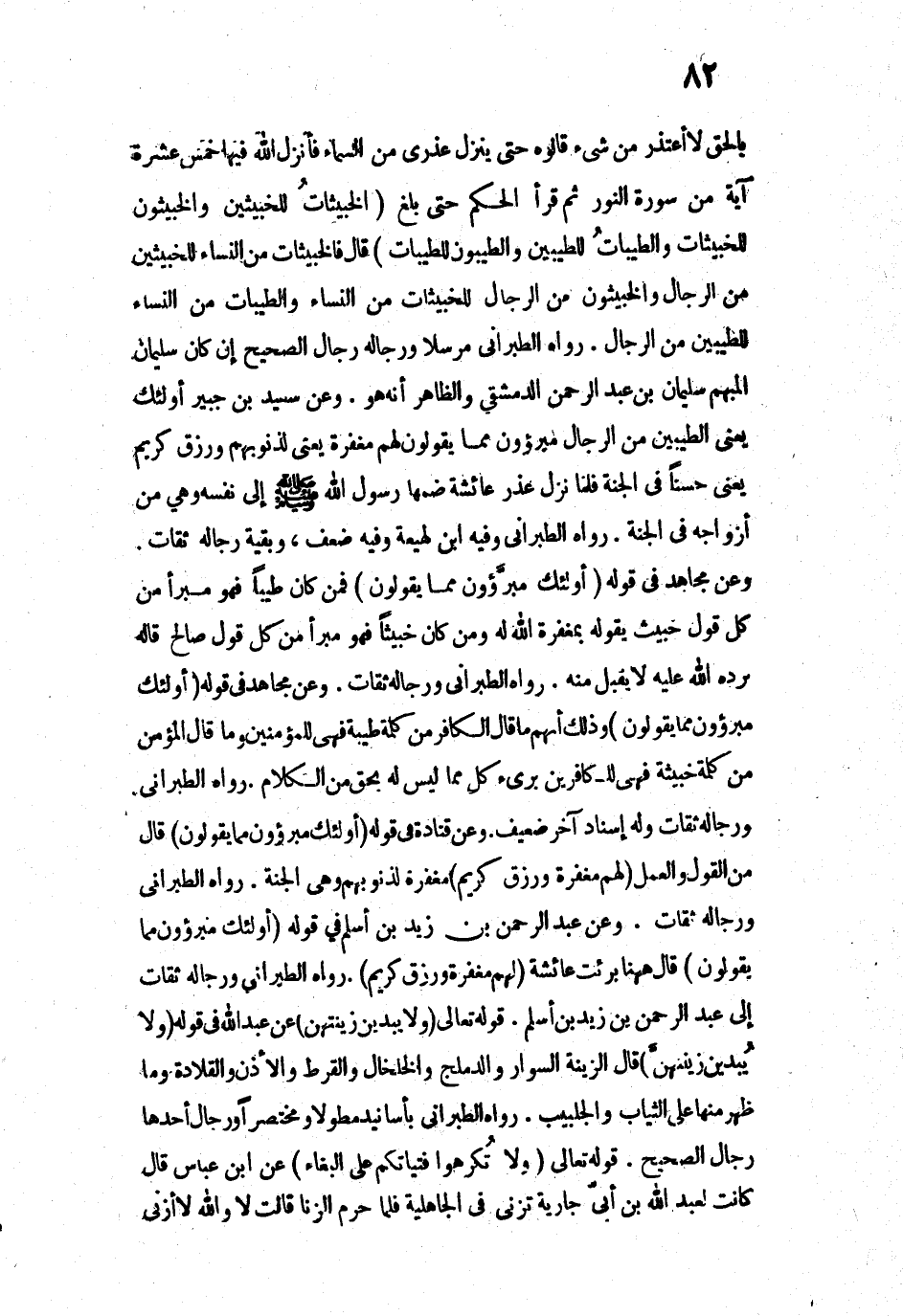 11225 - وَعَنْ سَعِيدِ بْنِ جُبَيْرٍ «أُولَئِكَ يَعْنِي الطَّيِّبِينَ مِنَ الرِّجَالِ مُبَرَّؤُونَ مِمَّا يَقُولُونَ [يَعْنِي: مِمَّا يَقُولُ هَؤُلَاءِ الْقَاذِفُونَ الَّذِينَ قَذَفُوا عَائِشَةَ: هُمْ بَرَاءٌ مِنَ الْكَلَامِ السَّيِّءِ، ثُمَّ قَالَ] لَهُمْ مَغْفِرَةٌ يَعْنِي لِذُنُوبِهِمْ وَرِزْقٌ كَرِيمٌ يَعْنِي حَسَنًا فِي الْجَنَّةِ. فَلَمَّا نَزَلَ عُذْرُ عَائِشَةَ ضَمَّهَا رَسُولُ اللَّهِ - صَلَّى اللَّهُ عَلَيْهِ وَسَلَّمَ - إِلَى نَفْسِهِ وَهِيَ مِنْ أَزْوَاجِهِ فِي الْجَنَّةِ».