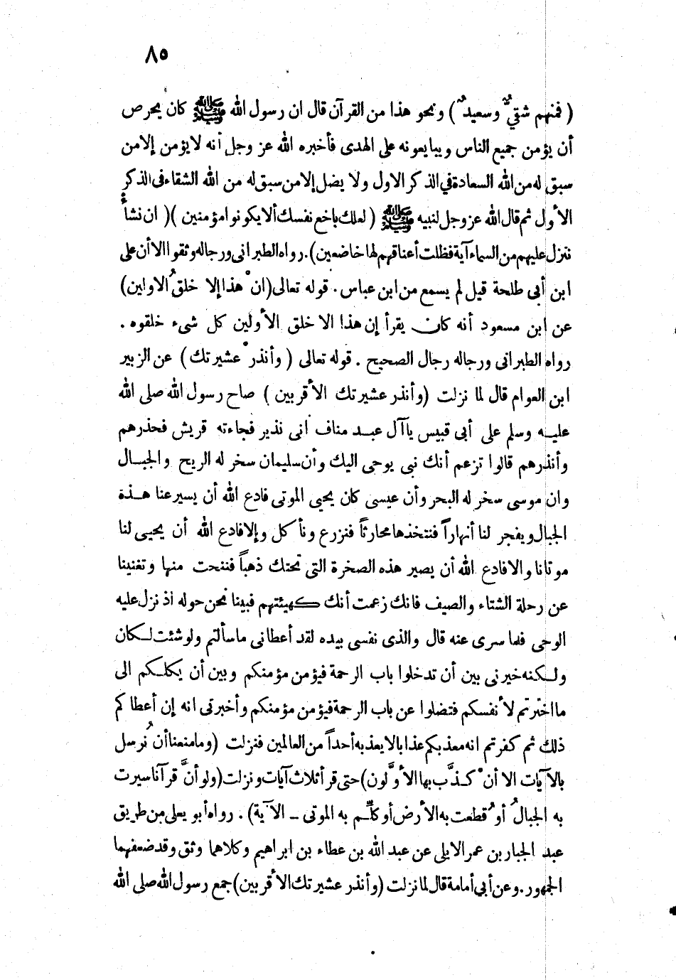 {فَمِنْهُمْ شَقِيٌّ وَسَعِيدٌ} [هود: 105] وَنَحْوِ هَذَا مِنَ الْقُرْآنِ قَالَ: «إِنَّ رَسُولَ اللَّهِ - صَلَّى اللَّهُ عَلَيْهِ وَسَلَّمَ - كَانَ يَحْرِصُ أَنْ يُؤْمِنَ جَمِيعُ النَّاسِ وَيُبَايِعُونَهُ عَلَى الْهُدَى، فَأَخْبَرَهُ اللَّهُ - عَزَّ وَجَلَّ - أَنَّهُ لَا يُؤْمِنُ إِلَّا مَنْ سَبَقَ لَهُ مِنَ اللَّهِ السَّعَادَةُ فِي الذِّكْرِ الْأَوَّلِ، وَلَا يَضِلُّ إِلَّا مَنْ سَبَقَ لَهُ مِنَ اللَّهِ الشَّقَاءُ فِي الذِّكْرِ الْأَوَّلِ، ثُمَّ قَالَ اللَّهُ - عَزَّ وَجَلَّ - لِنَبِيِّهِ - صَلَّى اللَّهُ عَلَيْهِ وَسَلَّمَ -: {لَعَلَّكَ بَاخِعٌ نَفْسَكَ أَلَّا يَكُونُوا مُؤْمِنِينَ - إِنْ نَشَأْ نُنَزِّلْ عَلَيْهِمْ مِنَ السَّمَاءِ آيَةً فَظَلَّتْ أَعْنَاقُهُمْ لَهَا خَاضِعِينَ} [الشعراء: 3 - 4]».