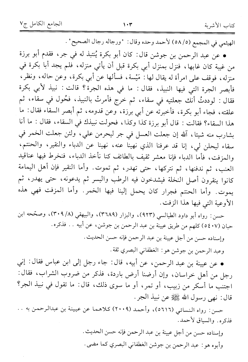• عن عيينة بن عبد الرحمن، عن أبيه، قال: جاء رجل إلى ابن عباس فقال: إني رجل من أهل خراسان، وإن أرضنا أرض باردة، فذكر من ضروب الشراب، فقال: اجتنب ما أسكر من زبيب، أو تمر، أو ما سوى ذلك، قال: ما تقول في نبيذ الجر؟ قال: نهى رسول الله - صلى الله عليه وسلم - عن نبيذ الجر.