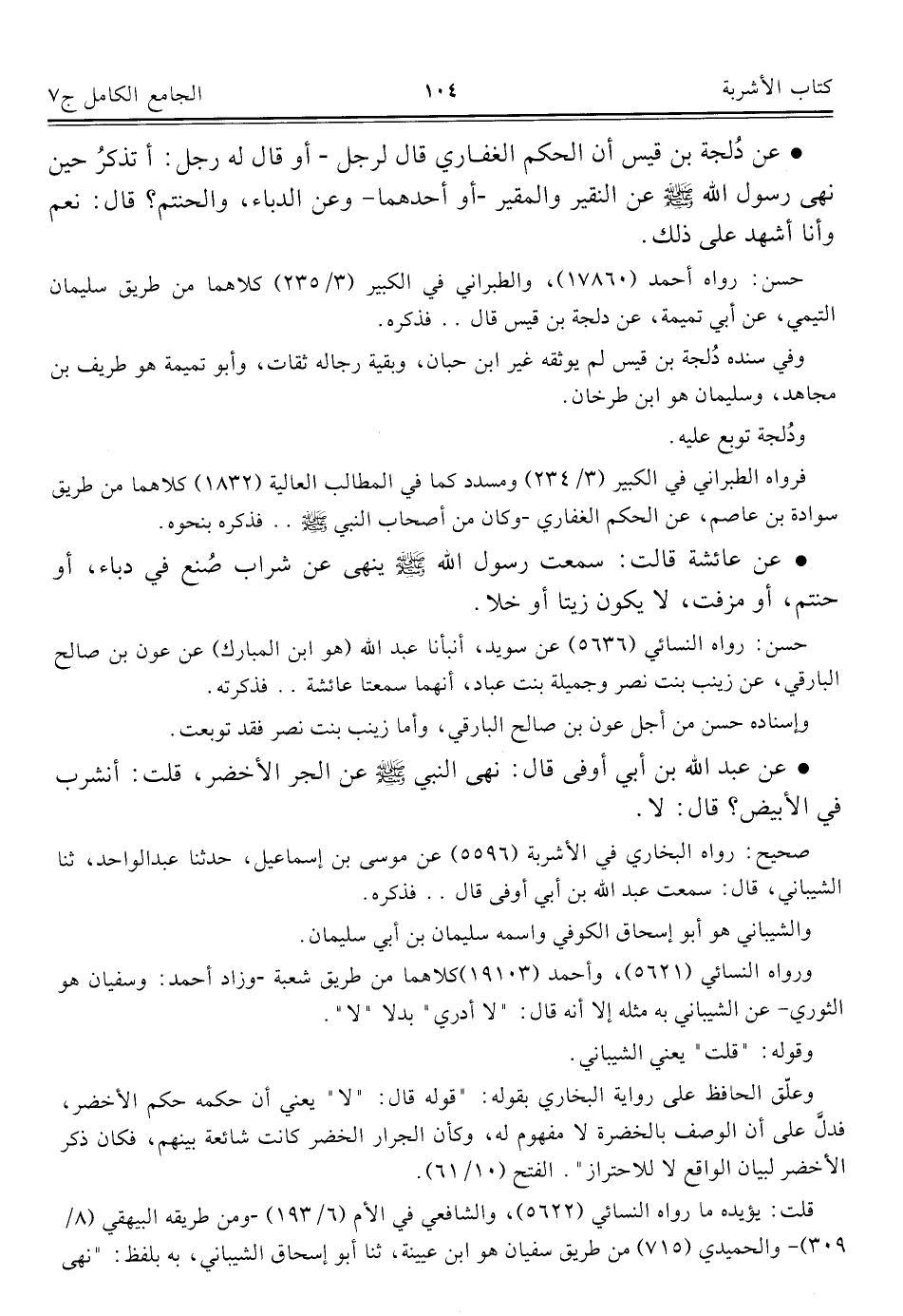 • عن دُلجة بن قيس أن الحكم الغفاري قال لرجل - أو قال له رجل: أتذكرُ حين نهى رسول الله - صلى الله عليه وسلم - عن النقير والمقير - أو أحدهما - وعن الدباء، والحنتم؟ قال: نعم وأنا أشهد على ذلك.