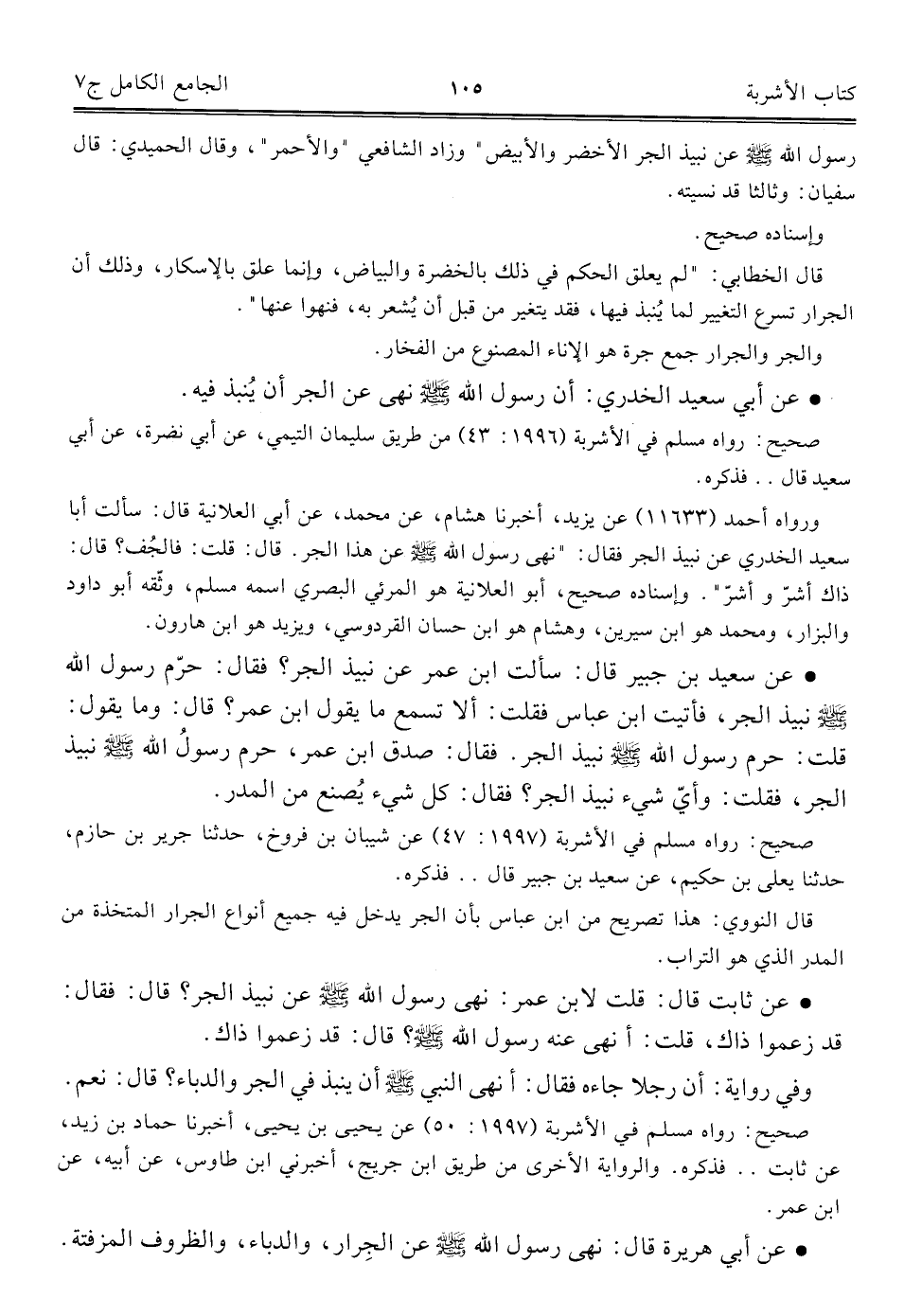 • عن سعيد بن جبير قال: سألت ابن عمر عن نبيذ الجر؟ فقال: حرّم رسول الله - صلى الله عليه وسلم - نبيذ الجر، فأتيت ابن عباس فقلت: ألا تسمع ما يقول ابن عمر؟ قال: وما يقول: قلت: حرم رسول الله - صلى الله عليه وسلم - نبيذ الجر. فقال: صدق ابن عمر، حرم رسولُ الله - صلى الله عليه وسلم - نبيذ الجر، فقلت: وأيّ شيء نبيذ الجر؟ فقال: كل شيء يُصنع من المدر.