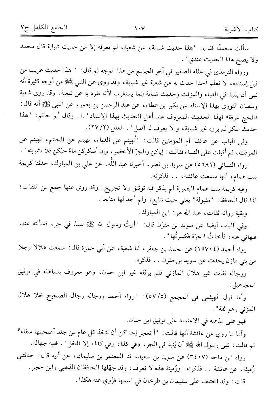 ورواه الترمذي في علله الصغير في آخر الجامع من هذا الوجه ثم قال: "هذا حديث غريب من قبل إسناده، لا نعلم أحدا حدث به عن شعبة غير شبابة، وقد روي عن النبي - صلى الله عليه وسلم - من أوجه كثيرة أنه نهى أن ينتبذ في الدباء والمزفت وحديث شبابة إنما يستغرب لأنه تفرد به عن شعبة. وقد روي شعبة وسفيان الثوري بهذا الإسناد عن بكير بن عطاء، عن عبد الرحمن بن يعمر، عن النبي - صلى الله عليه وسلم - أنه قال: "الحج عرفة" فهذا الحديث المعروف عند أهل الحديث بهذا الإسناد". ا. وقال أبو حاتم: "هذا حديث منكر لم يروه غير شبابة، ولا يعرف له أصل". العلل (٢/ ٢٧).