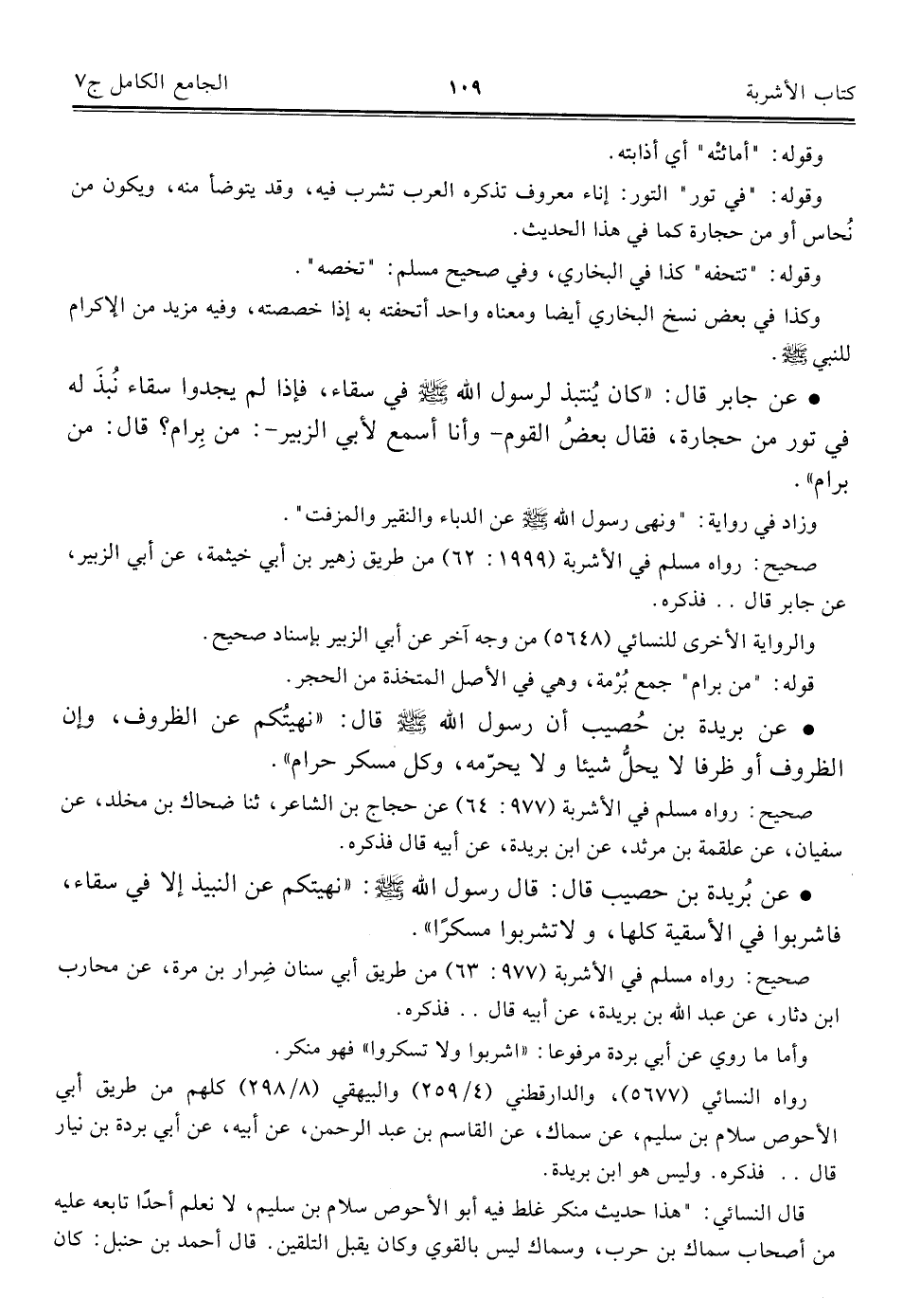 • عن بُريدة بن حصيب قال: قال رسول الله: "نهيتكم عن النبيذ إلا في سقاء، فاشربوا في الأسقية كلها، ولا تشربوا مسكرًا".
