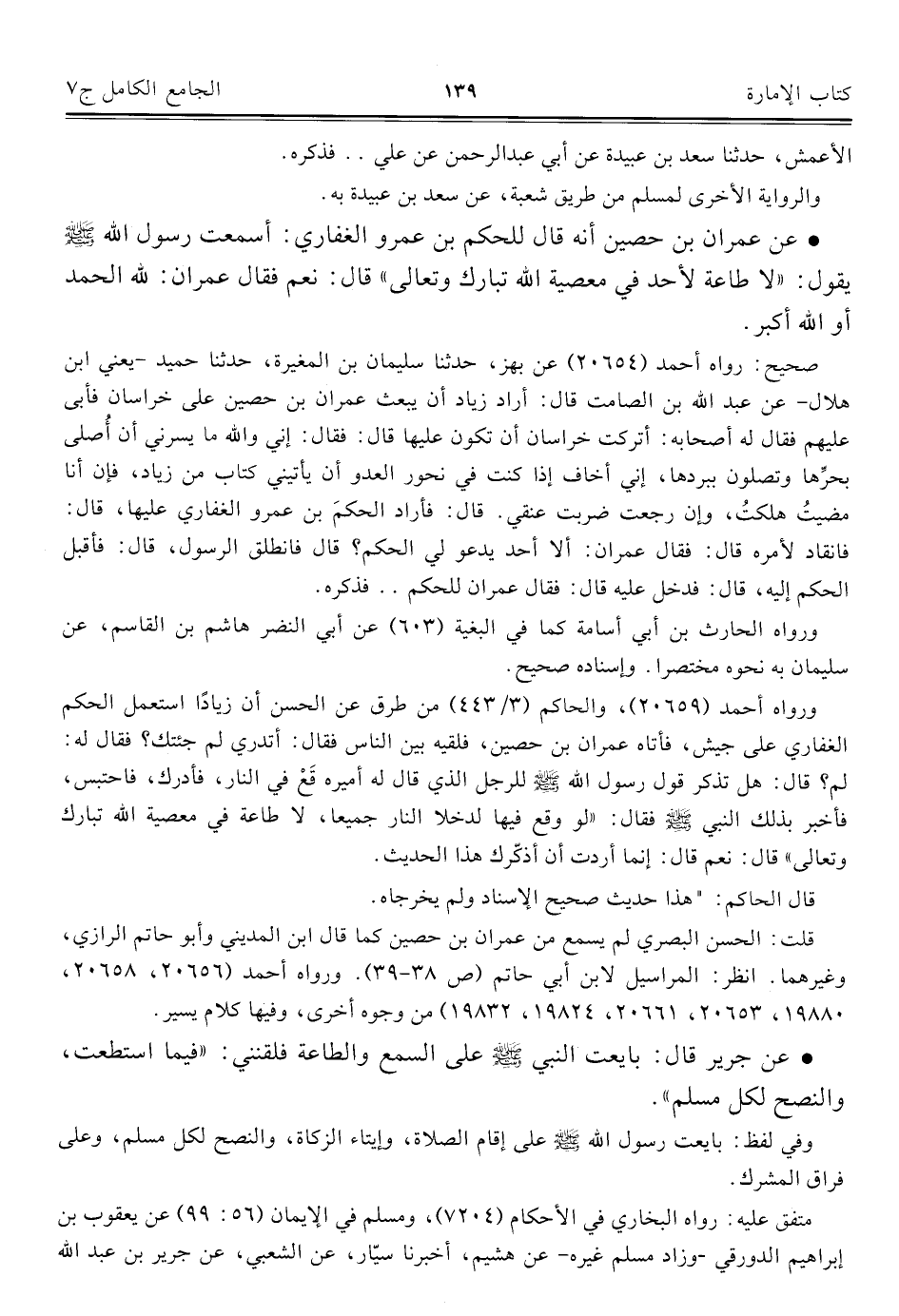 • عن عمران بن حصين أنه قال للحكم بن عمرو الغفاري: أسمعت رسول الله - صلى الله عليه وسلم - يقول: "لا طاعة لأحد في معصية الله تبارك وتعالى" قال: نعم فقال عمران: لله الحمد أو الله أكبر.